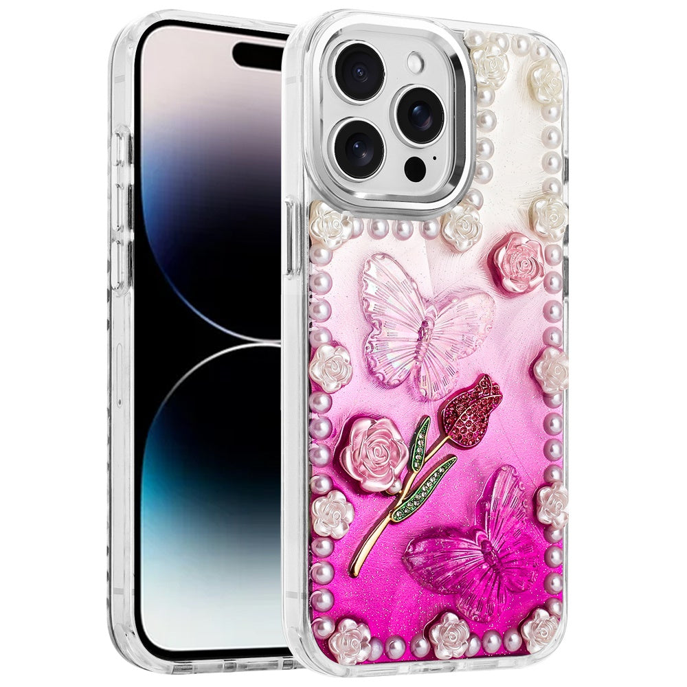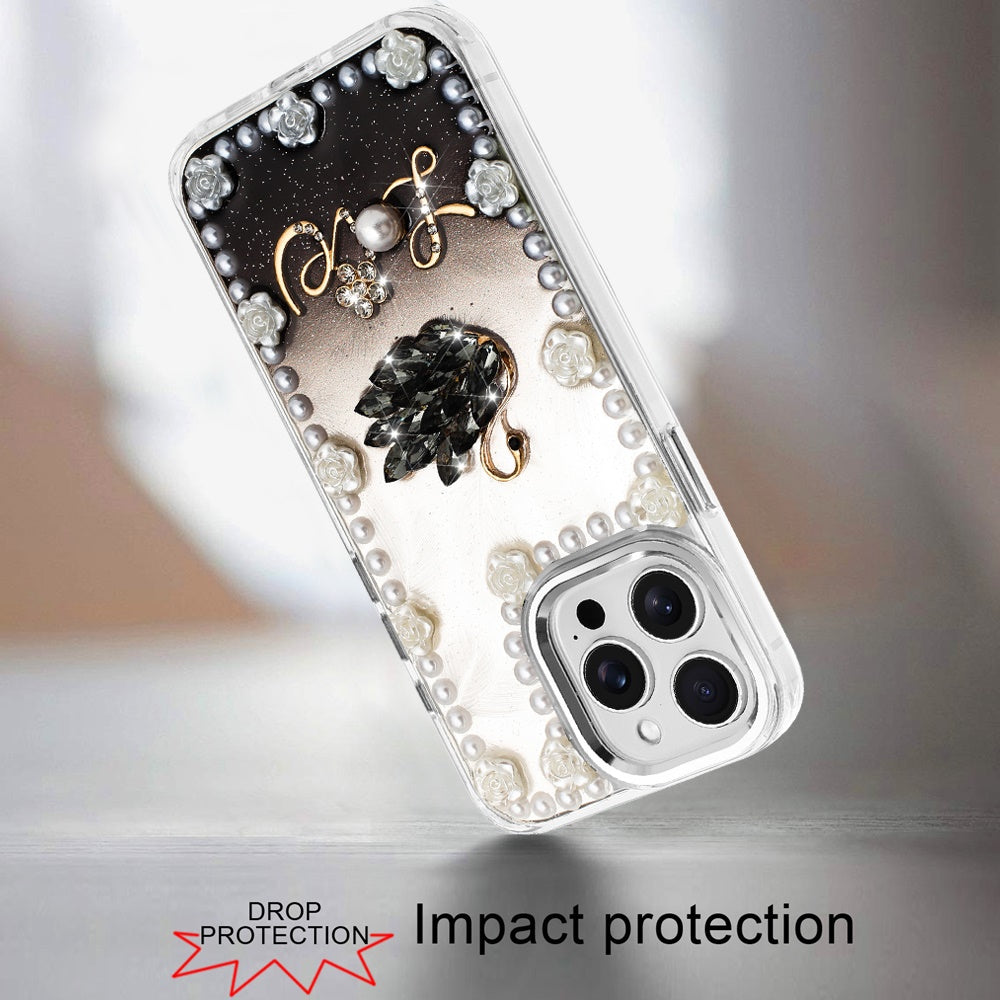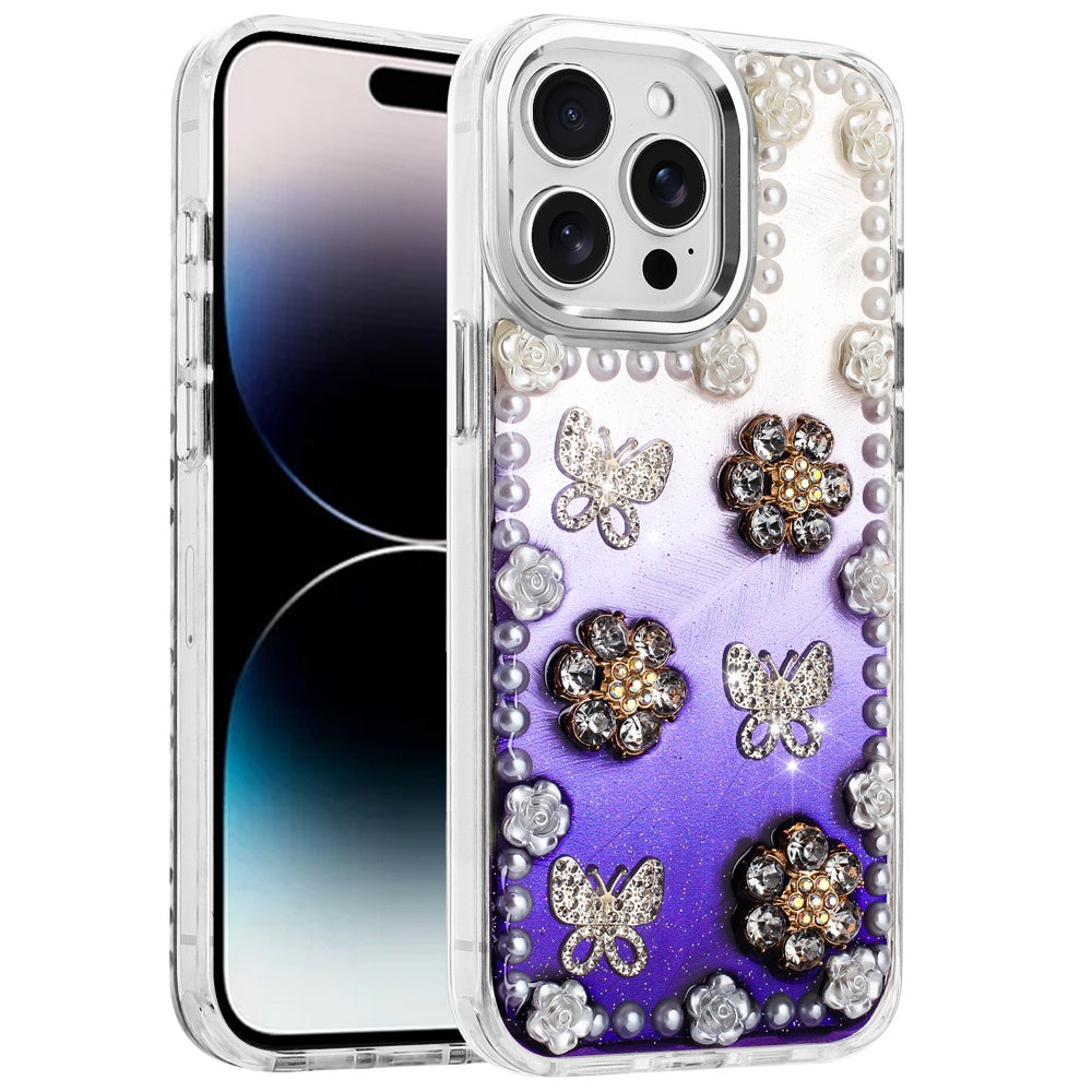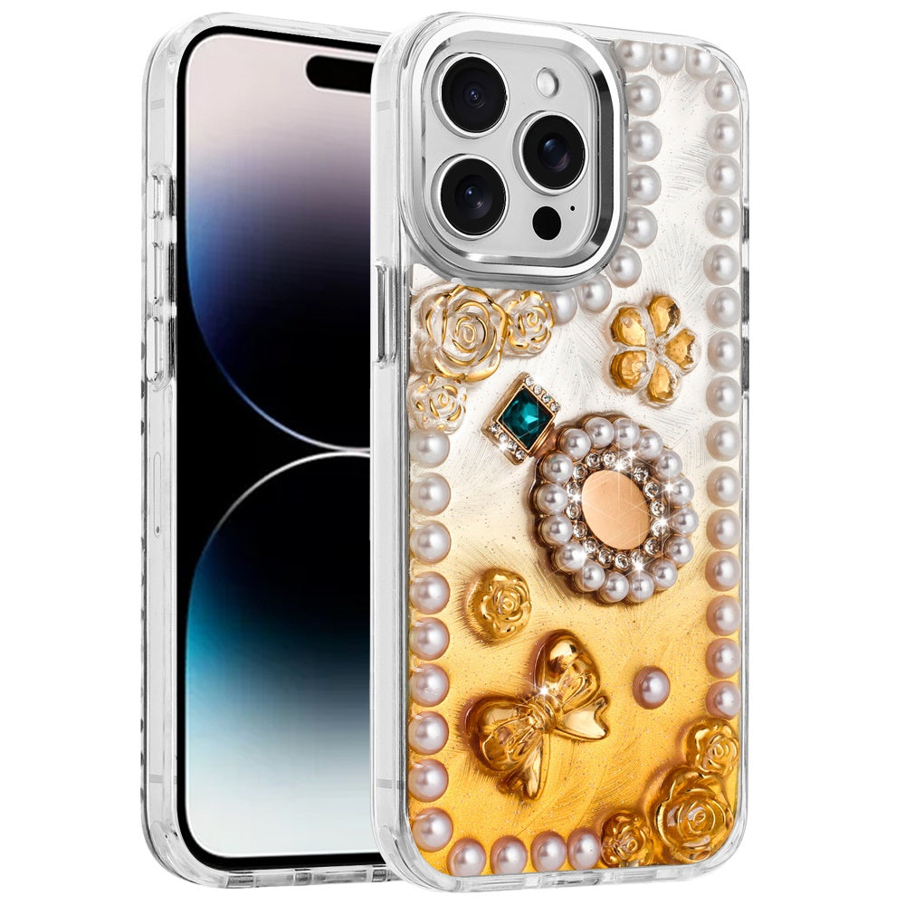 For iPhone 14 PRO MAX 6.7 in. Case Floral and Faux Pearl Trim with 3D Charms