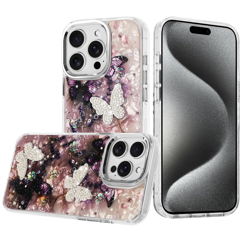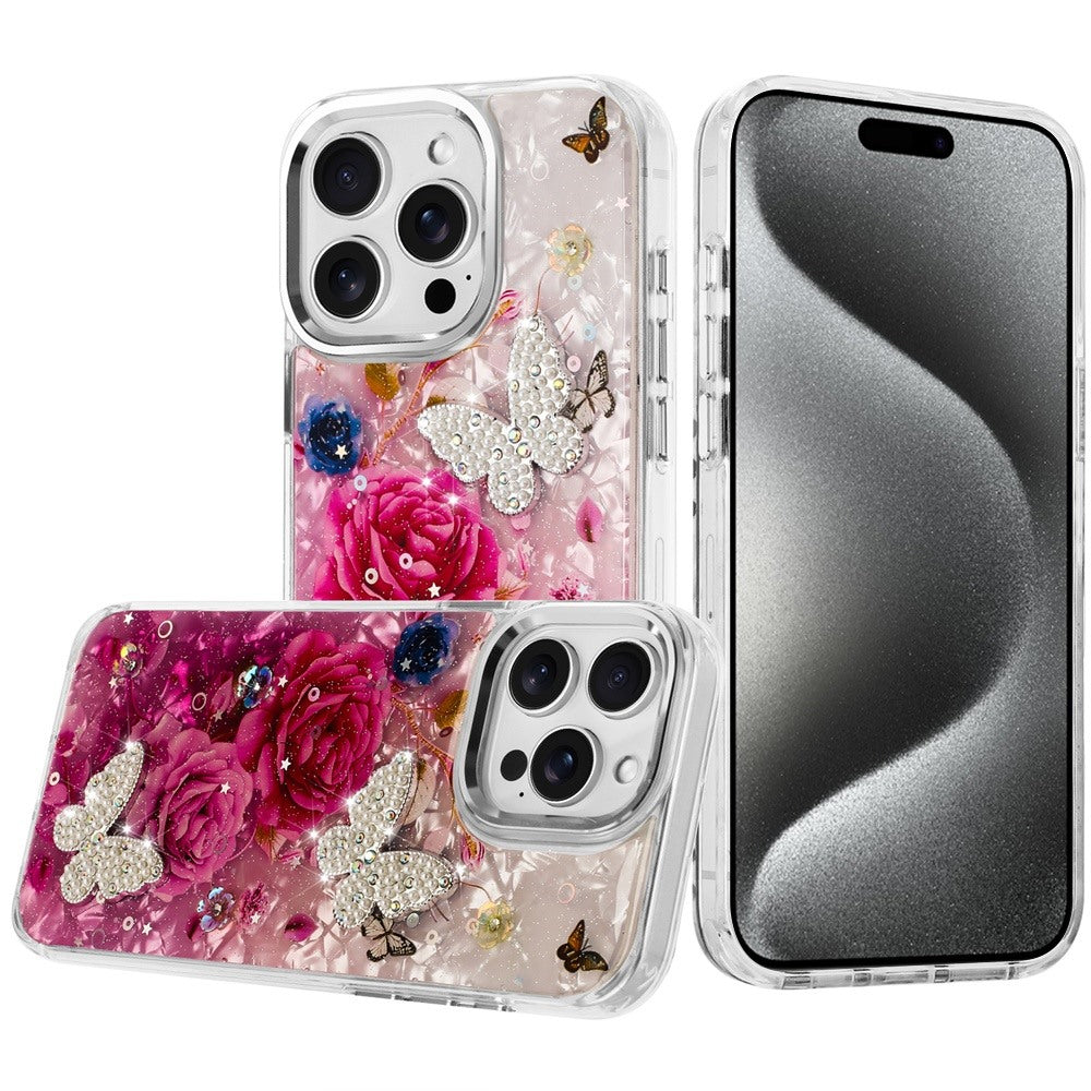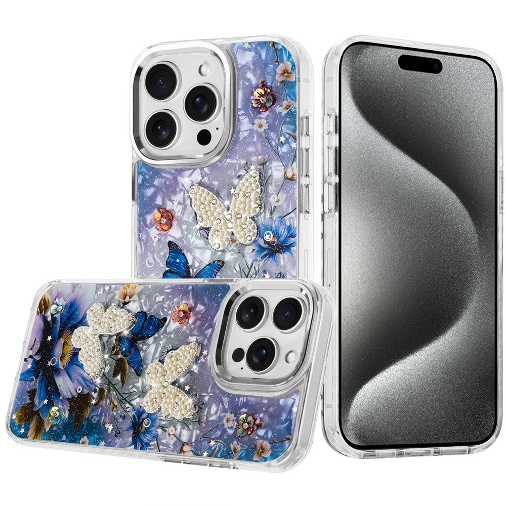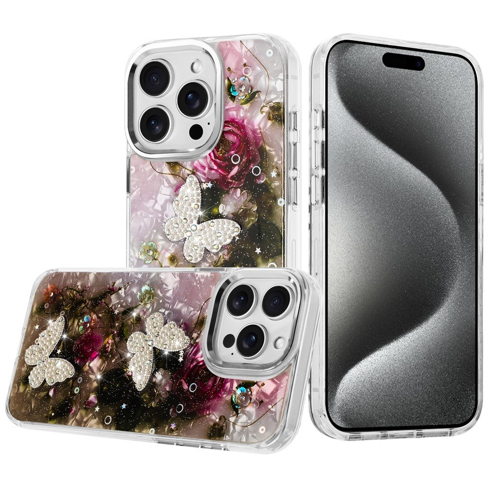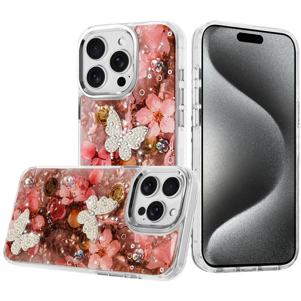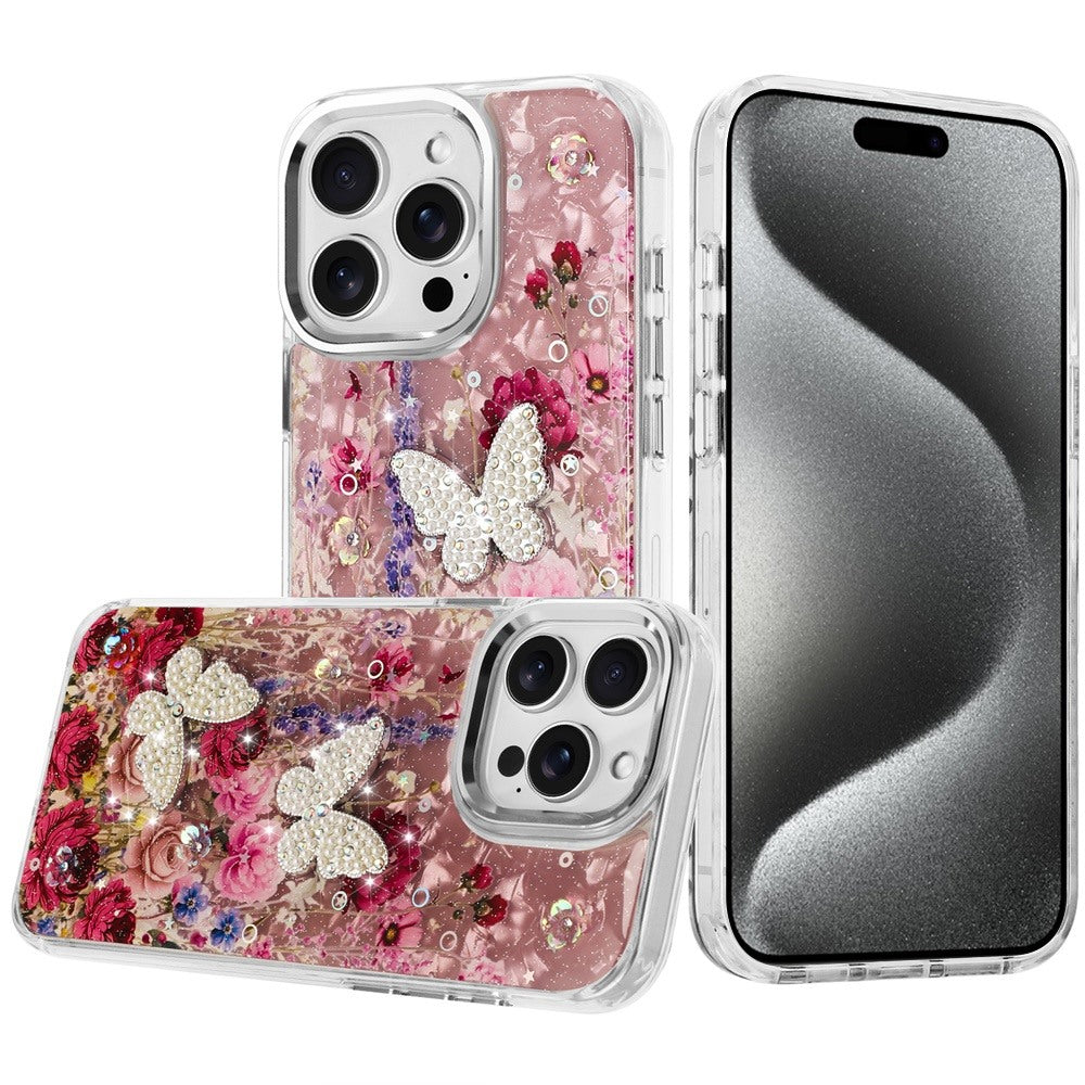 Floral Epoxy Glitter Case with 3D Beaded Butterflies + 2 Tempered Glass Screen Protector