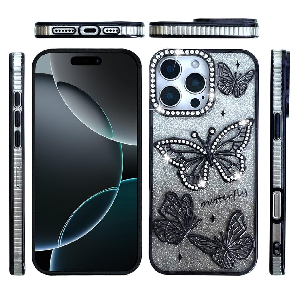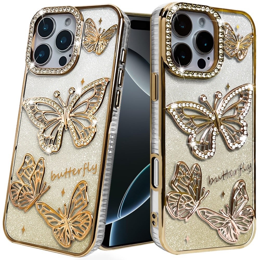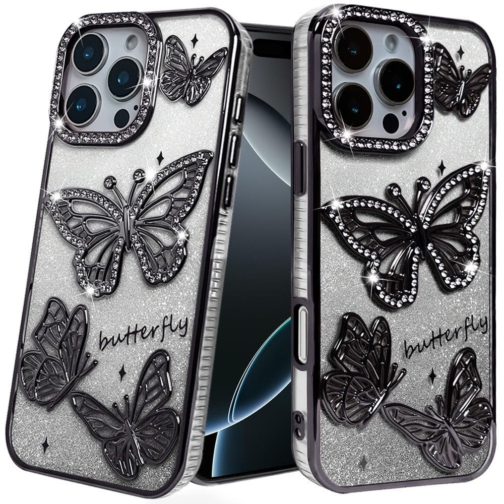 Bling Butterflies 3D Rhinestone Glitter Phone Cover with Tempered Glass Screen Protector