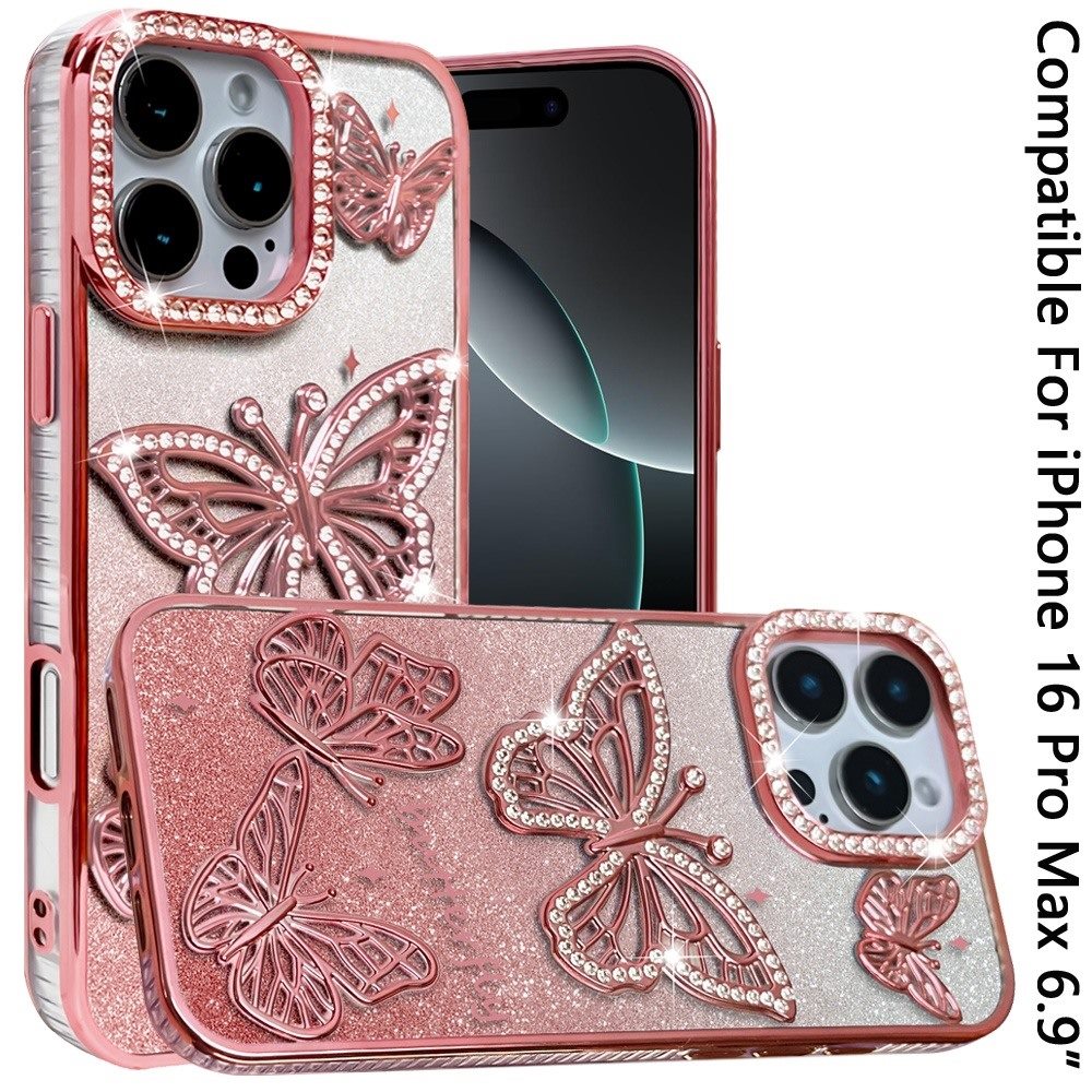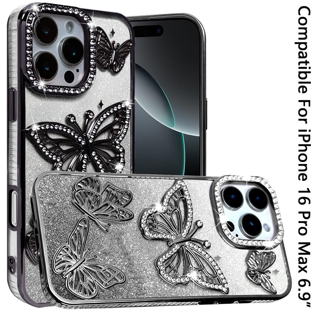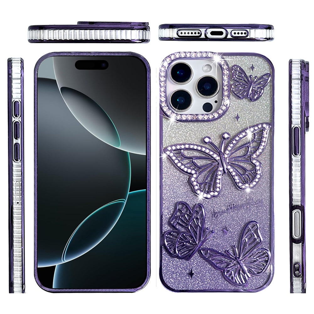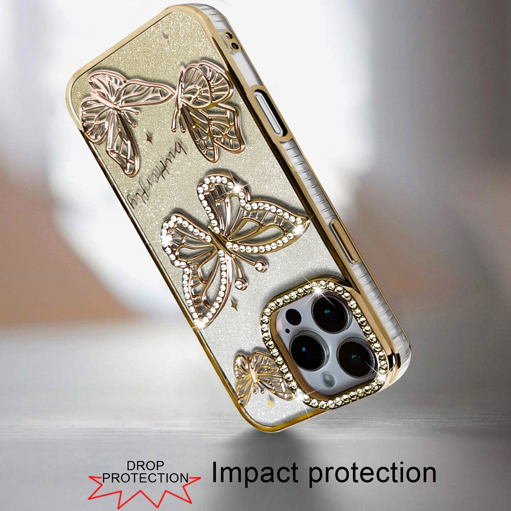 Bling Butterflies 3D Rhinestone Glitter Phone Cover with Tempered Glass Screen Protector