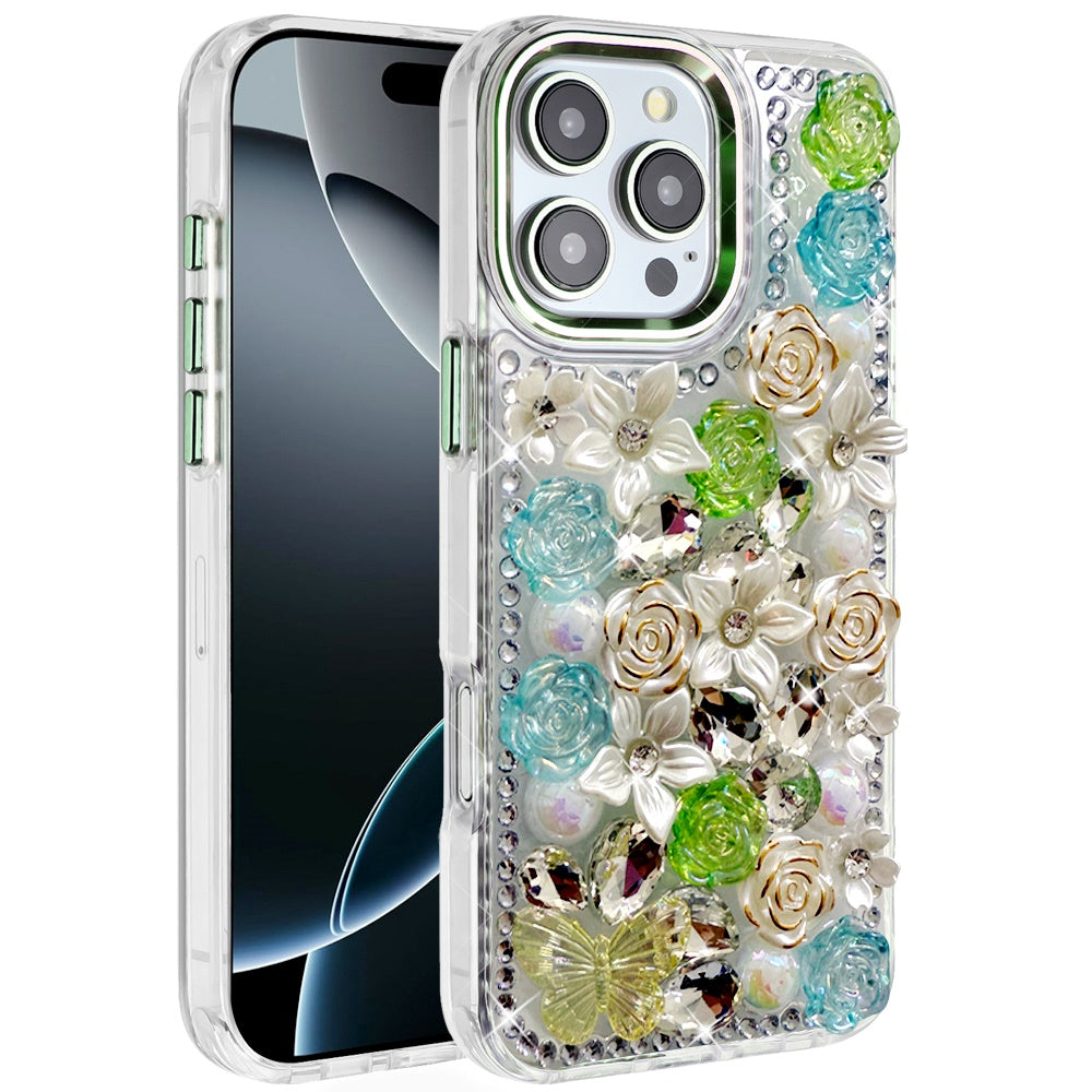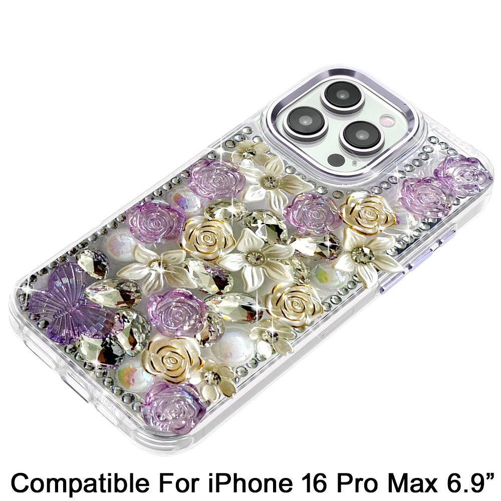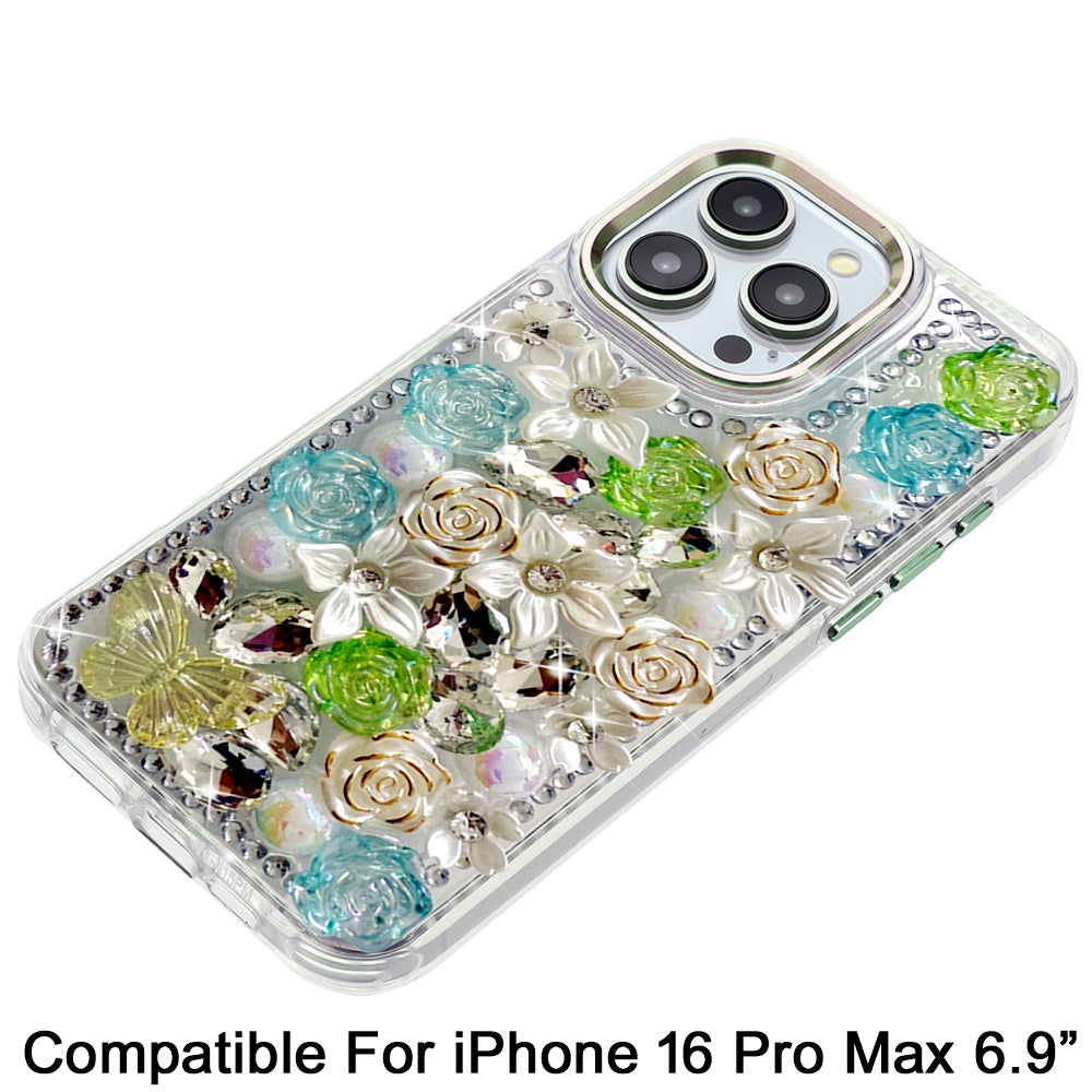 For iPhone 16 PRO MAX Case Floral Arrangement 3D Bling Cover + Tempered Glass
