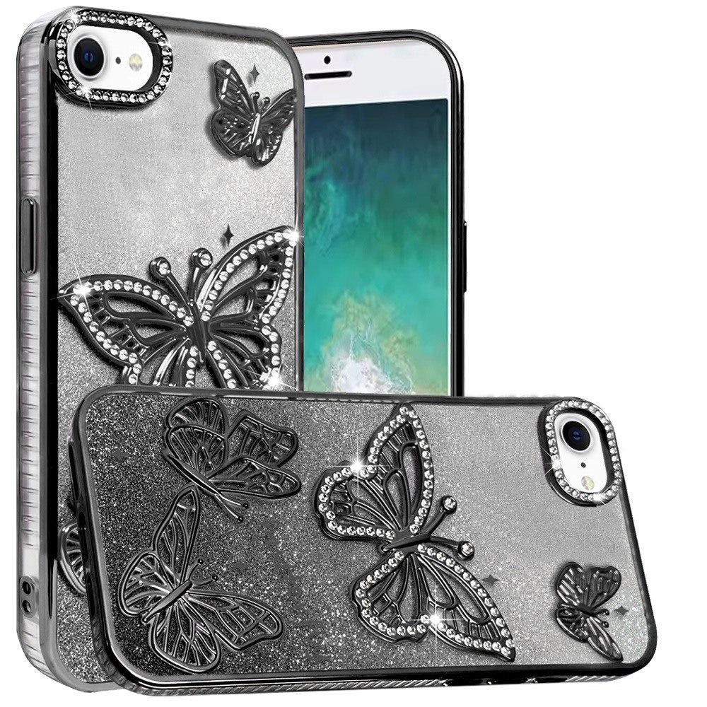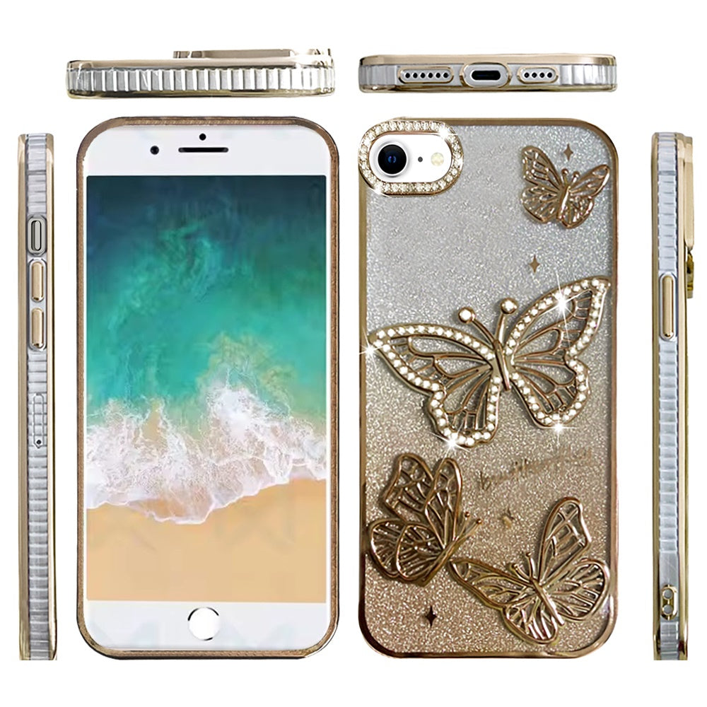 Bling Butterflies 3D Rhinestone Glitter Phone Cover with Tempered Glass Screen Protector