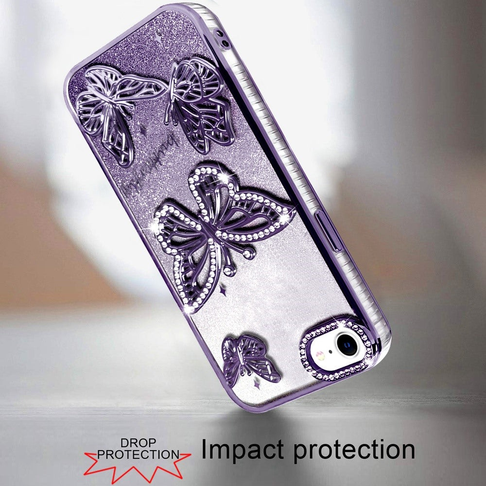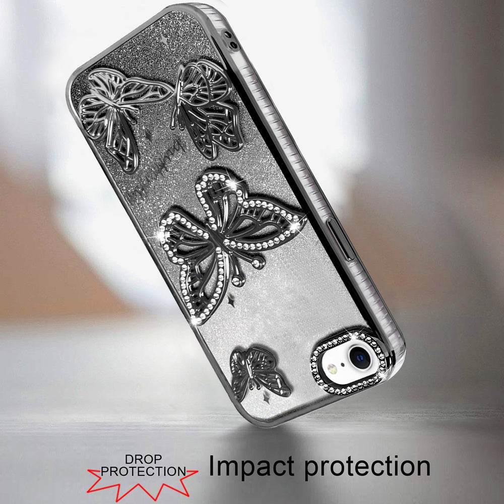 For iPhone 16e Case Bling Butterflies 3D Glitter Phone Cover + Tempered Glass