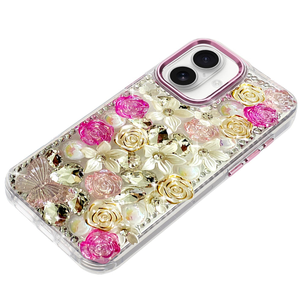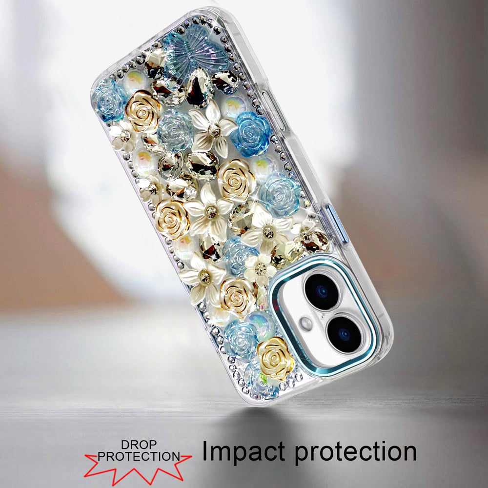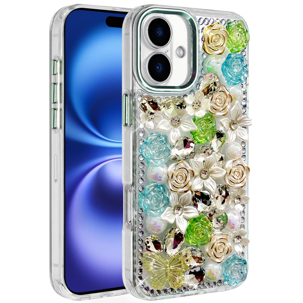 For iPhone 17 Case Full Floral 3D Bling Jewel Cute Phone Cover + Tempered Glass