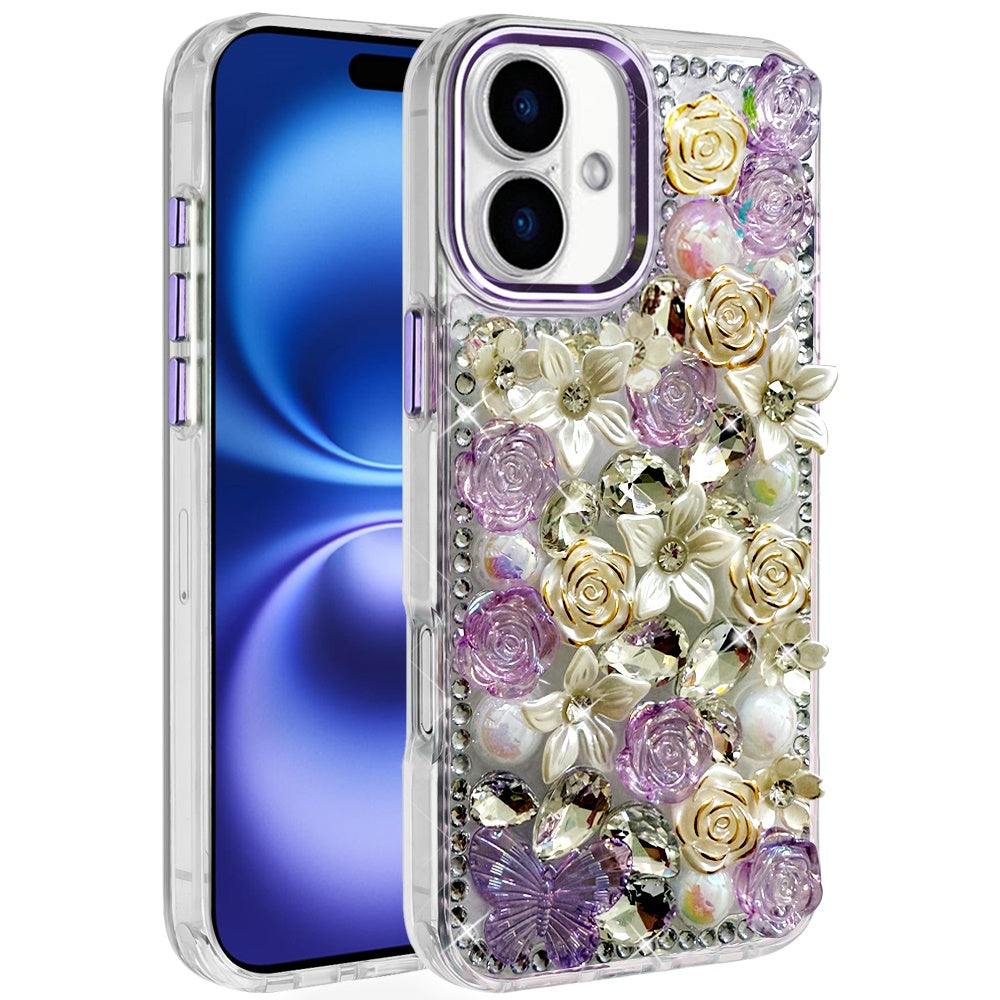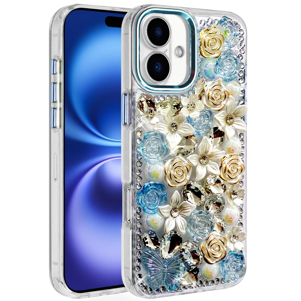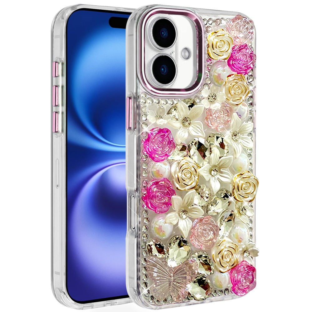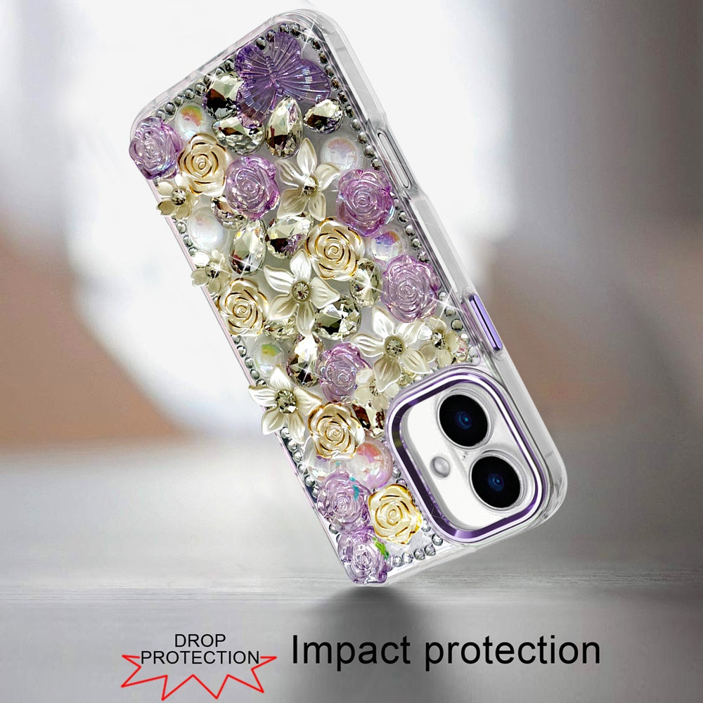 For iPhone 17 Case Full Floral 3D Bling Jewel Cute Phone Cover + Tempered Glass