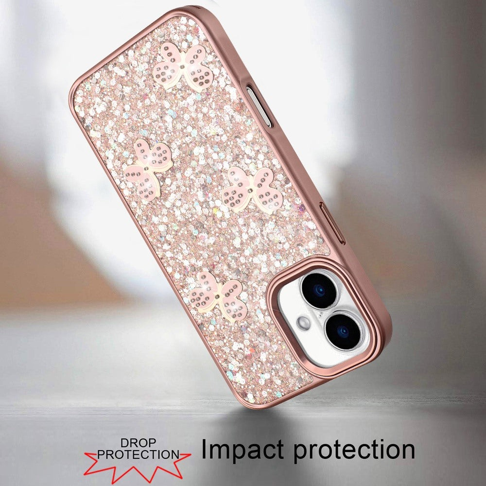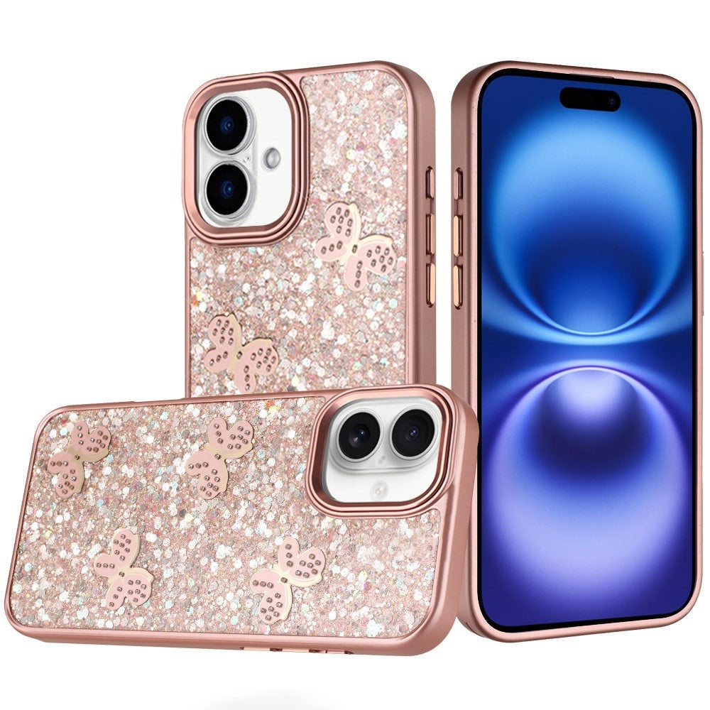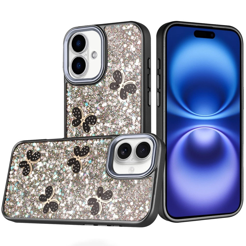 For iPhone 17 Case Full Glitter Flakes with Cute Butterflies + Tempered Glass