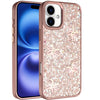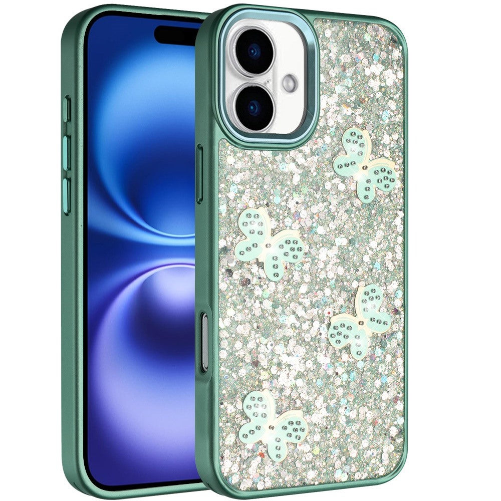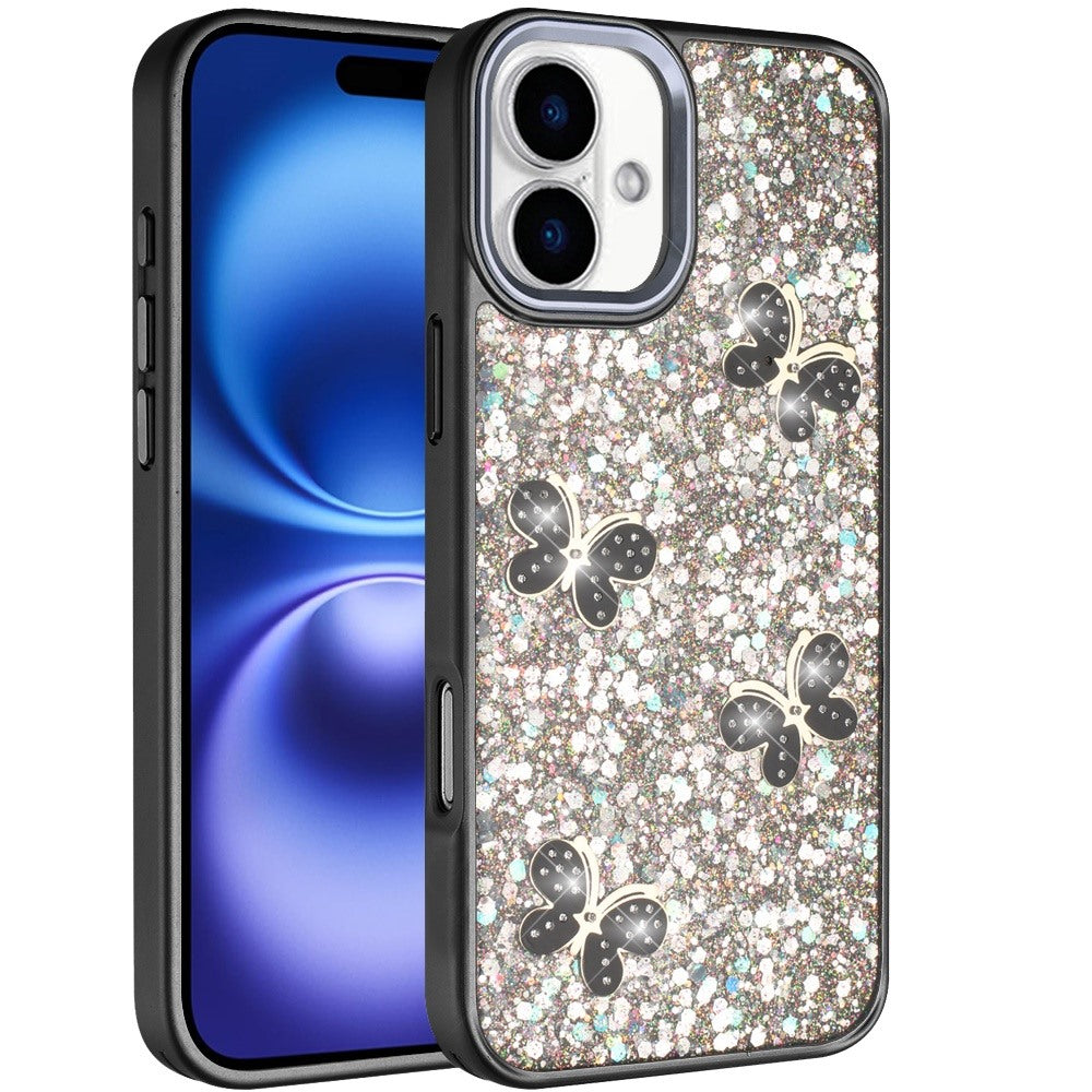 Full Glitter Flakes Phone Case with Cute Butterflies and Metallic Trim + Tempered Glass Screen Protector