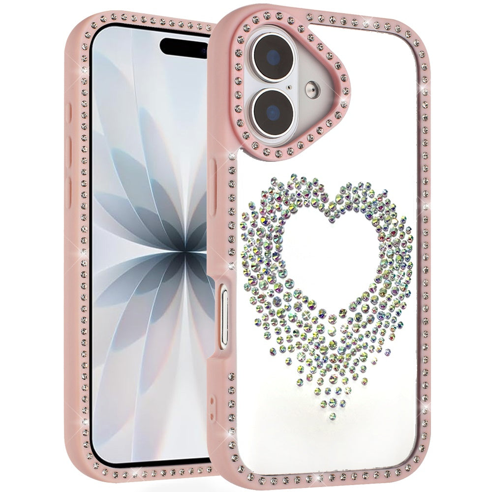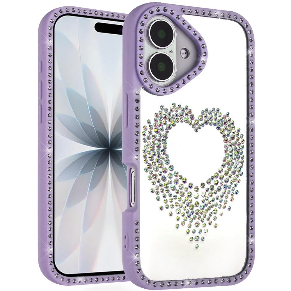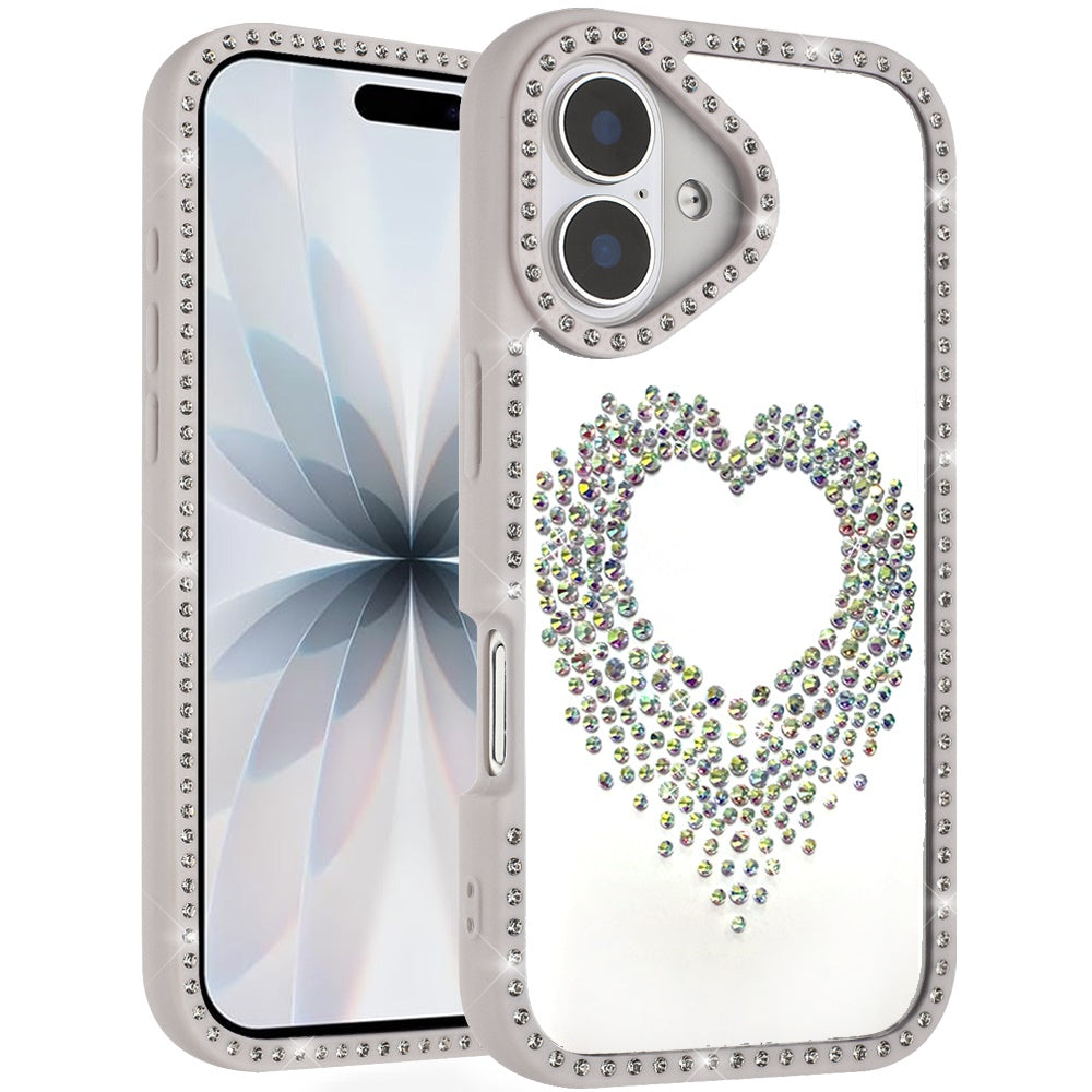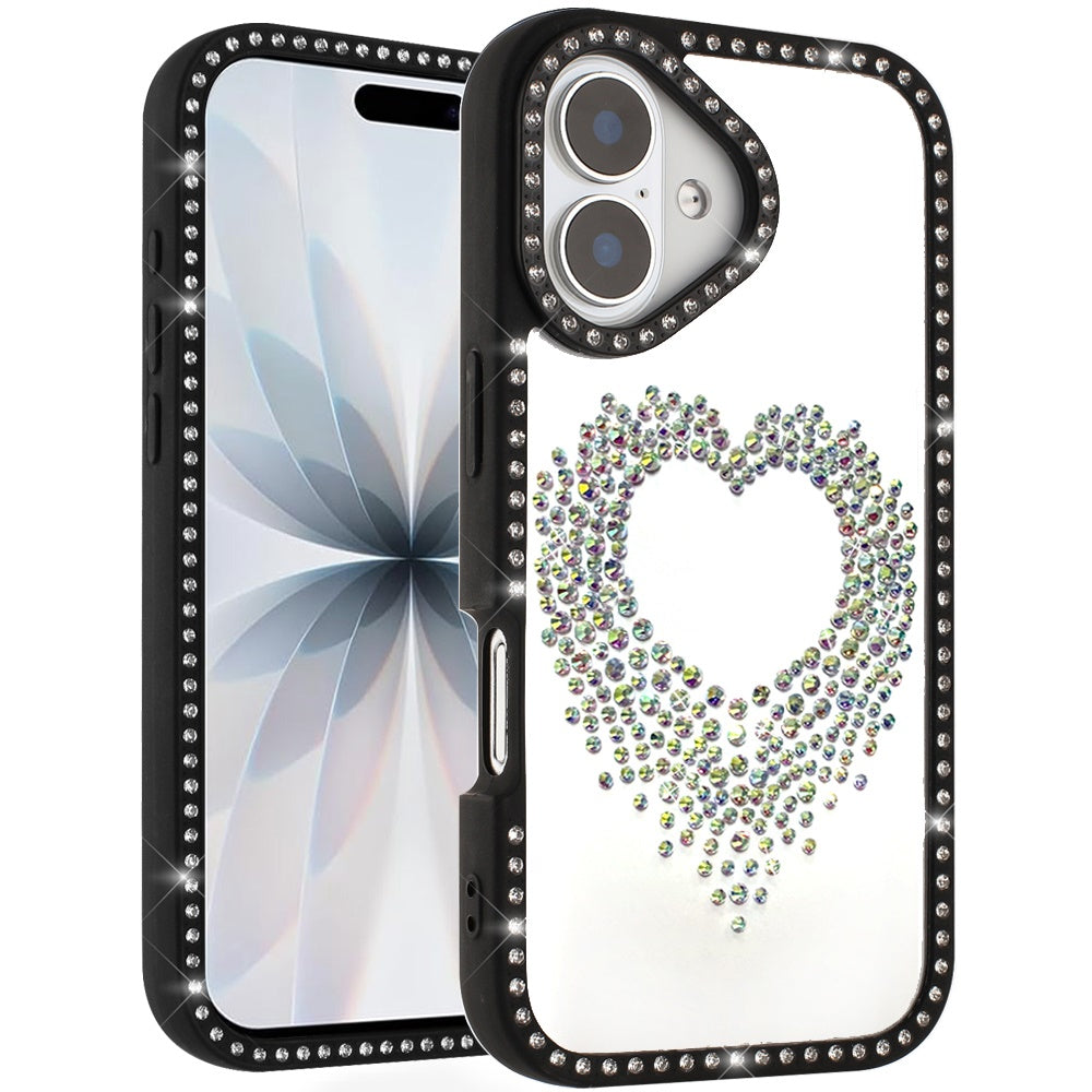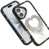 For iPhone 17 Case Heart Shaped Crystals w/ Bling Border Trim + Tempered Glass