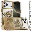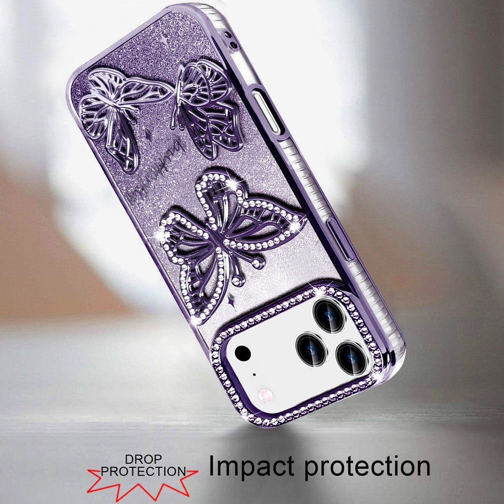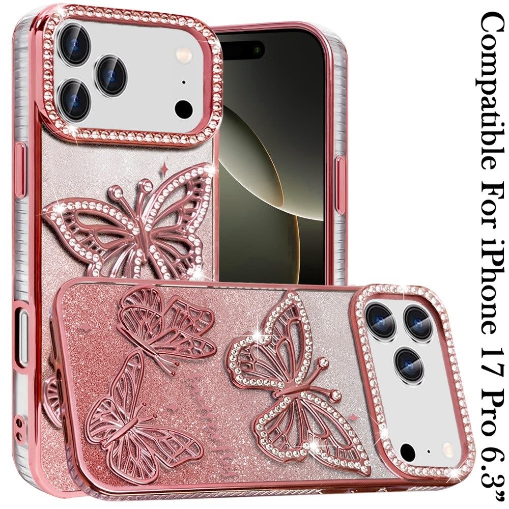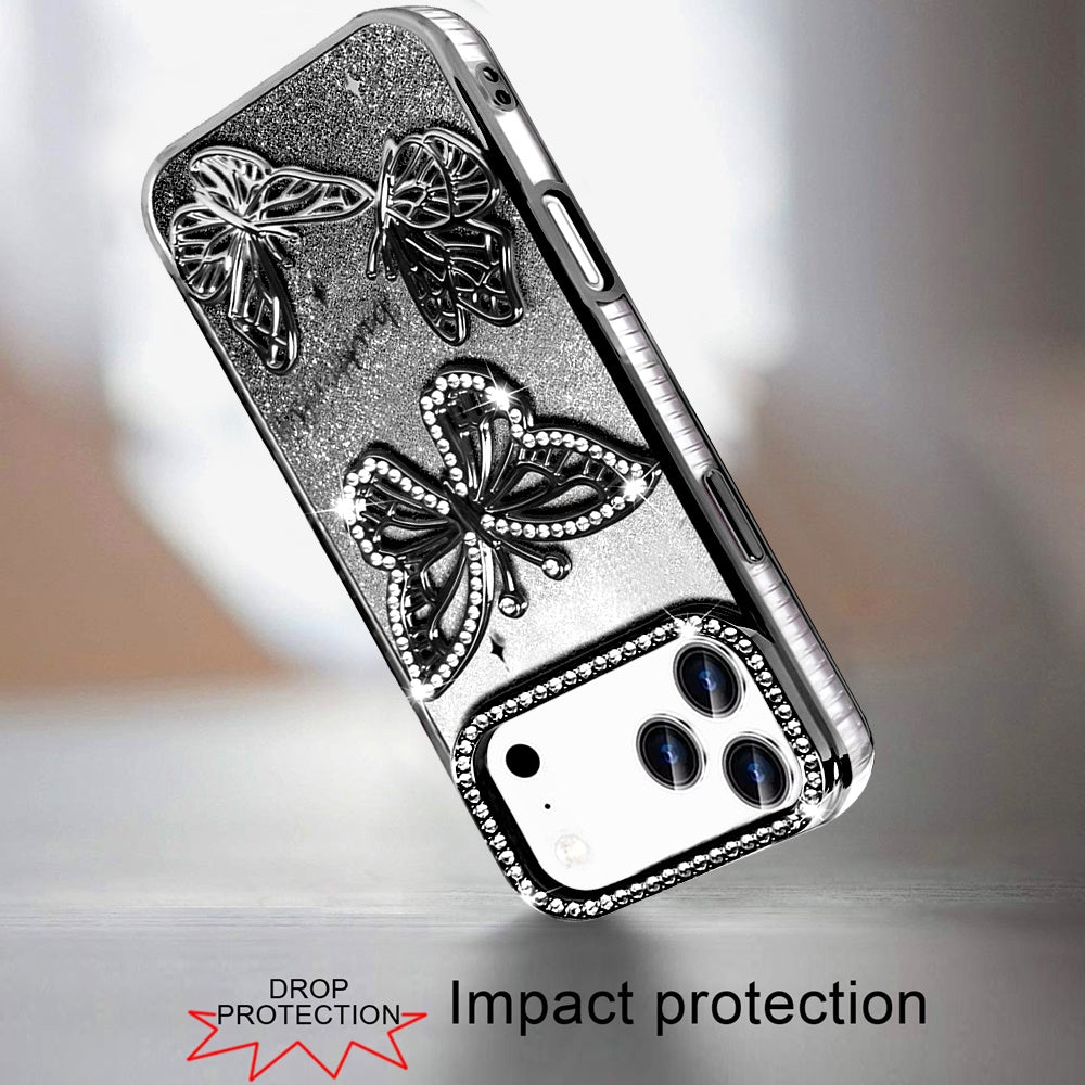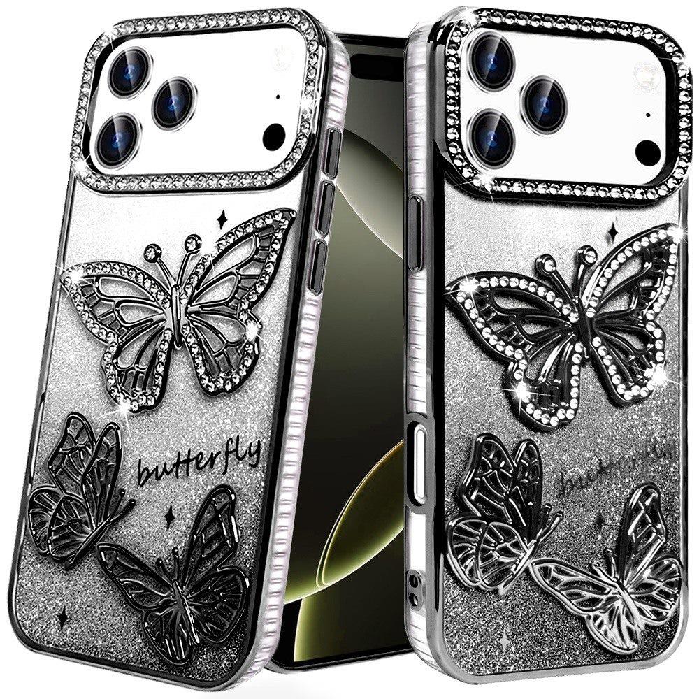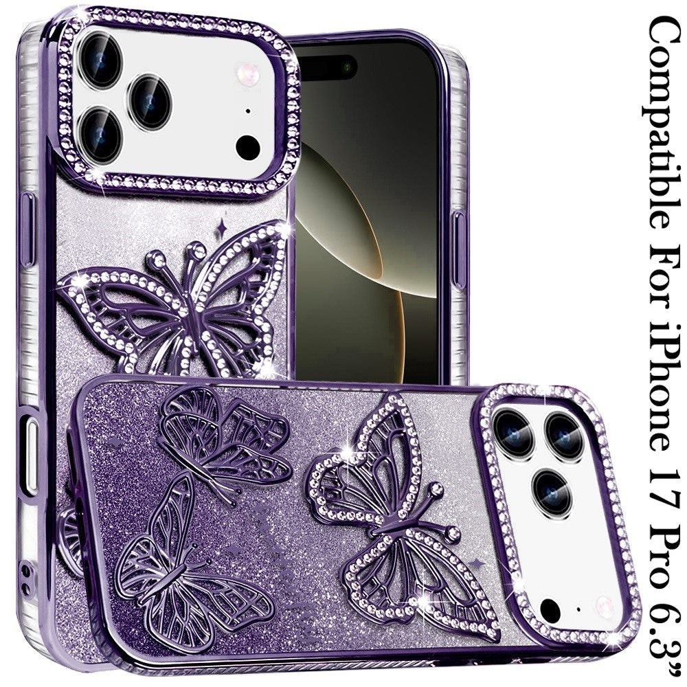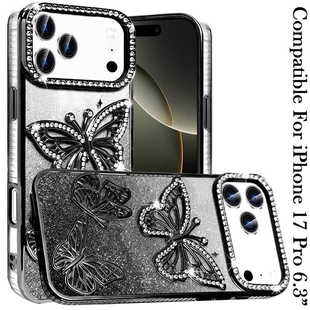 For iPhone 17 PRO Case Bling Butterflies 3D Glitter Phone Cover + Tempered Glass