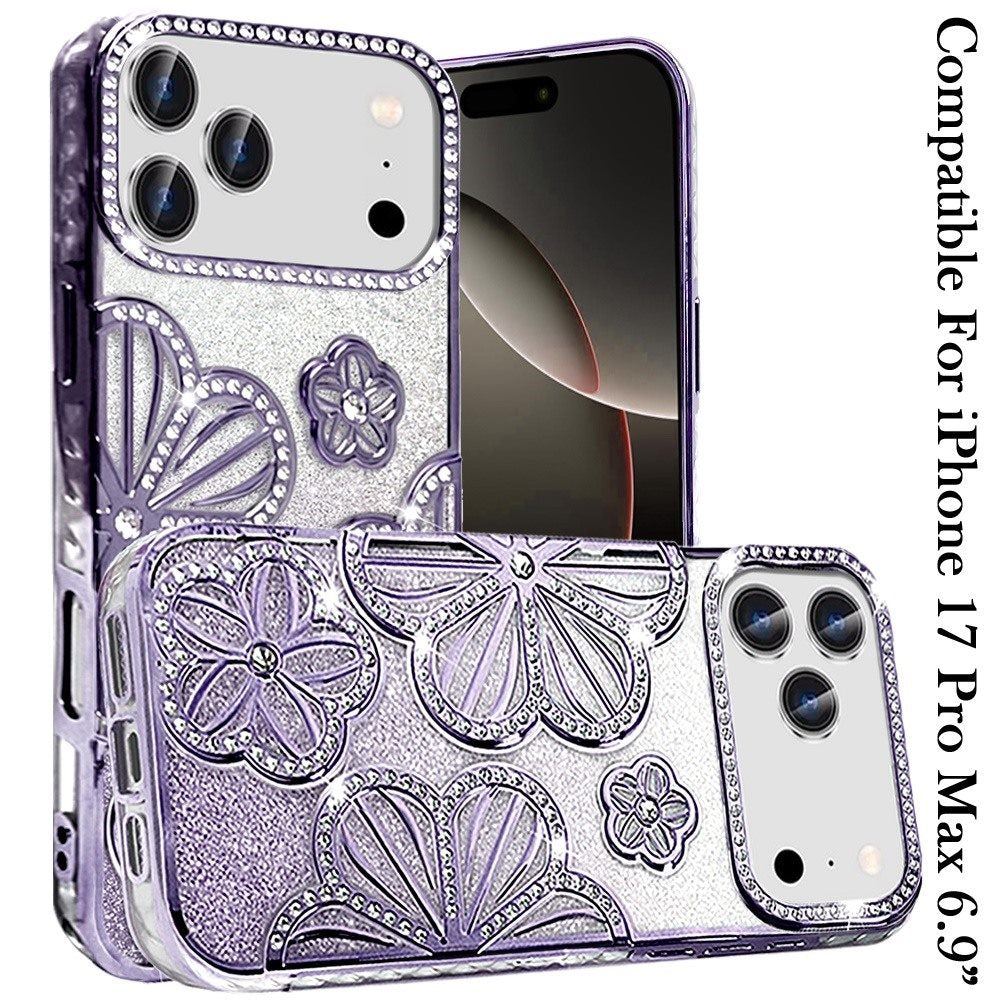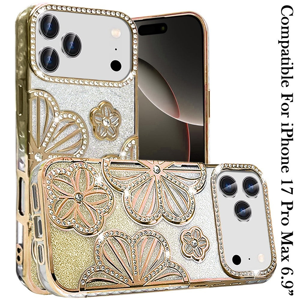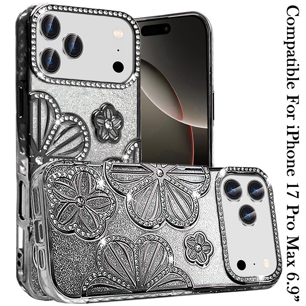 For iPhone 17 Pro Max Case Bling Floral 3D Glitter Phone Cover + Tempered Glass