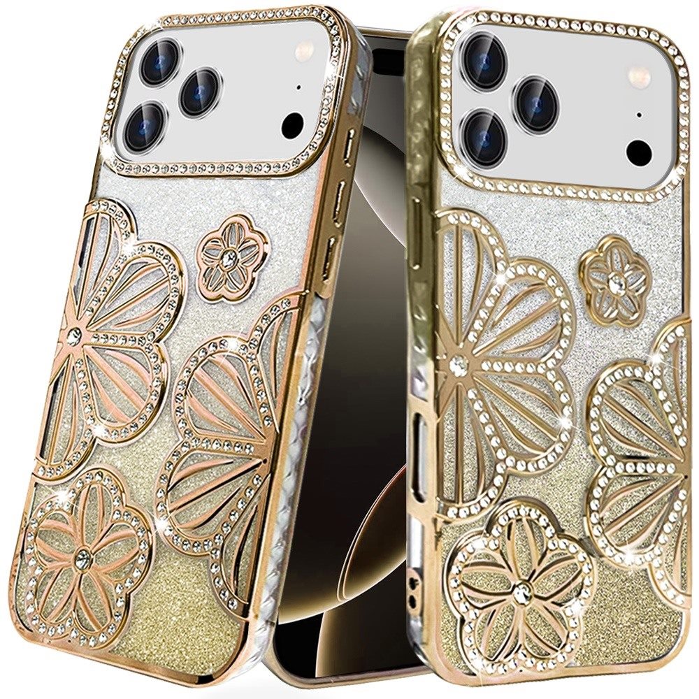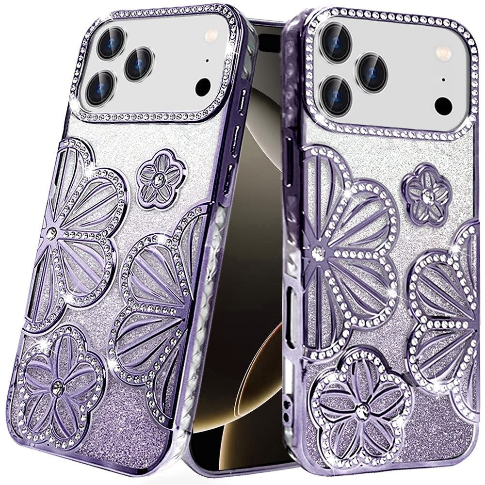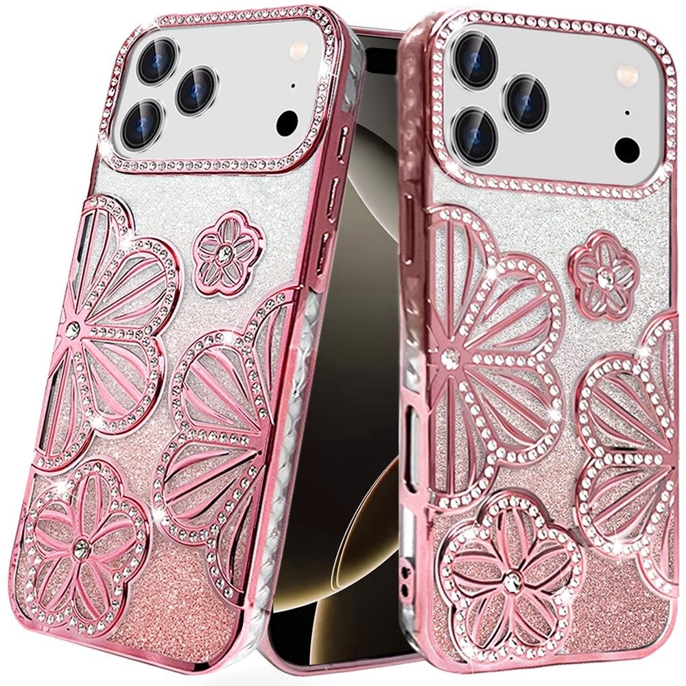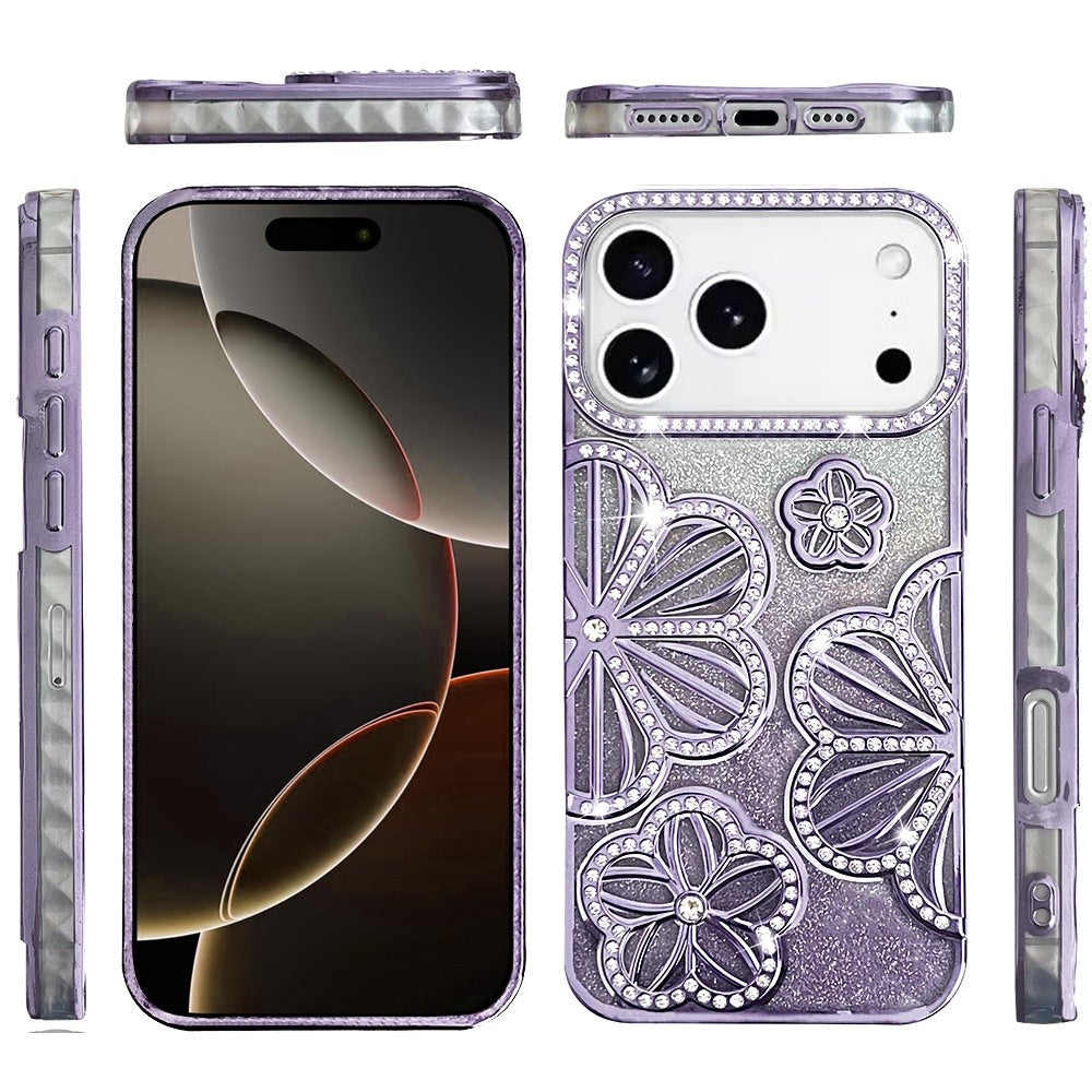For iPhone 17 Pro Max Case Bling Floral 3D Glitter Phone Cover + Tempered Glass