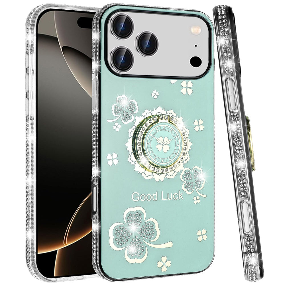 Glitter Four Leaf Clover Design All Around Crystal Studded Ring Stand Cover + Tempered Glass Screen Protector