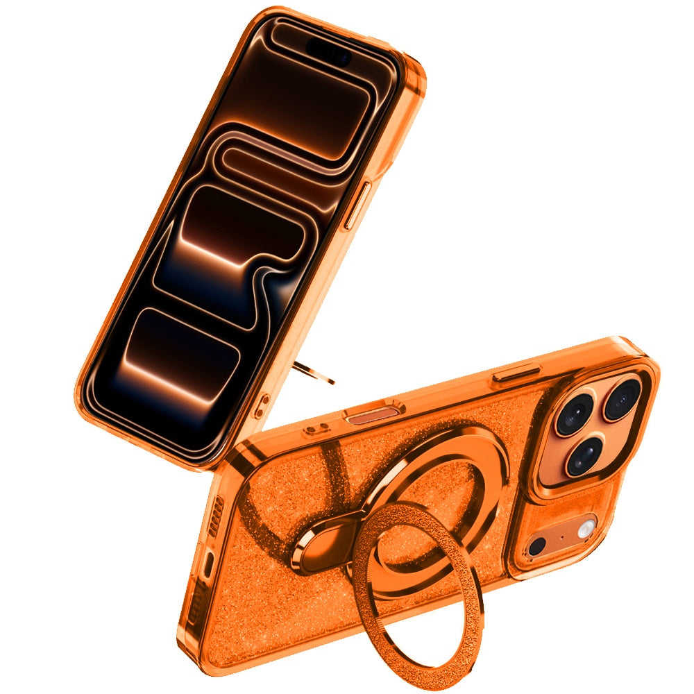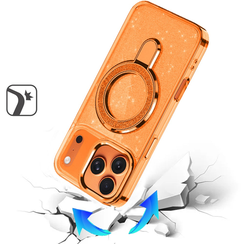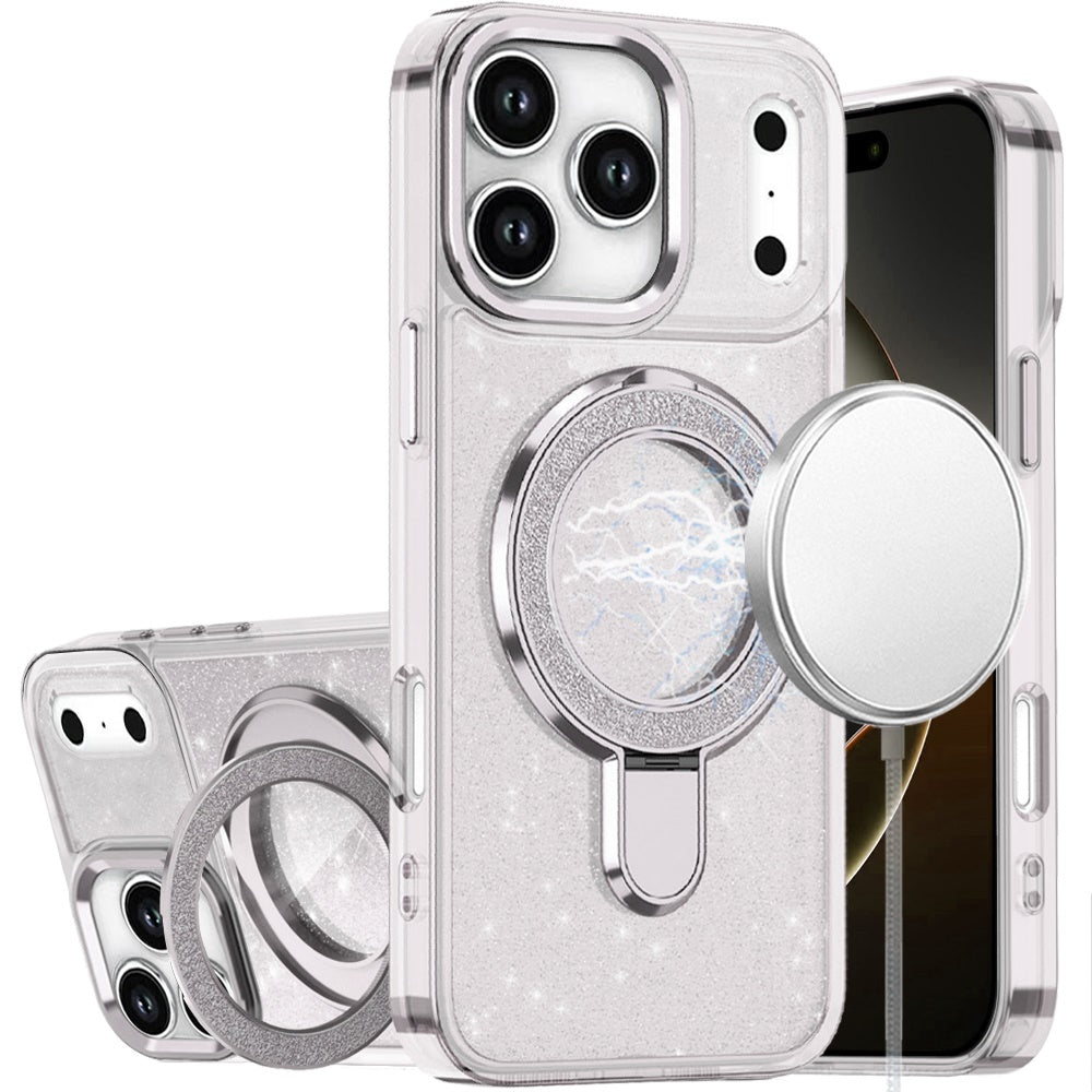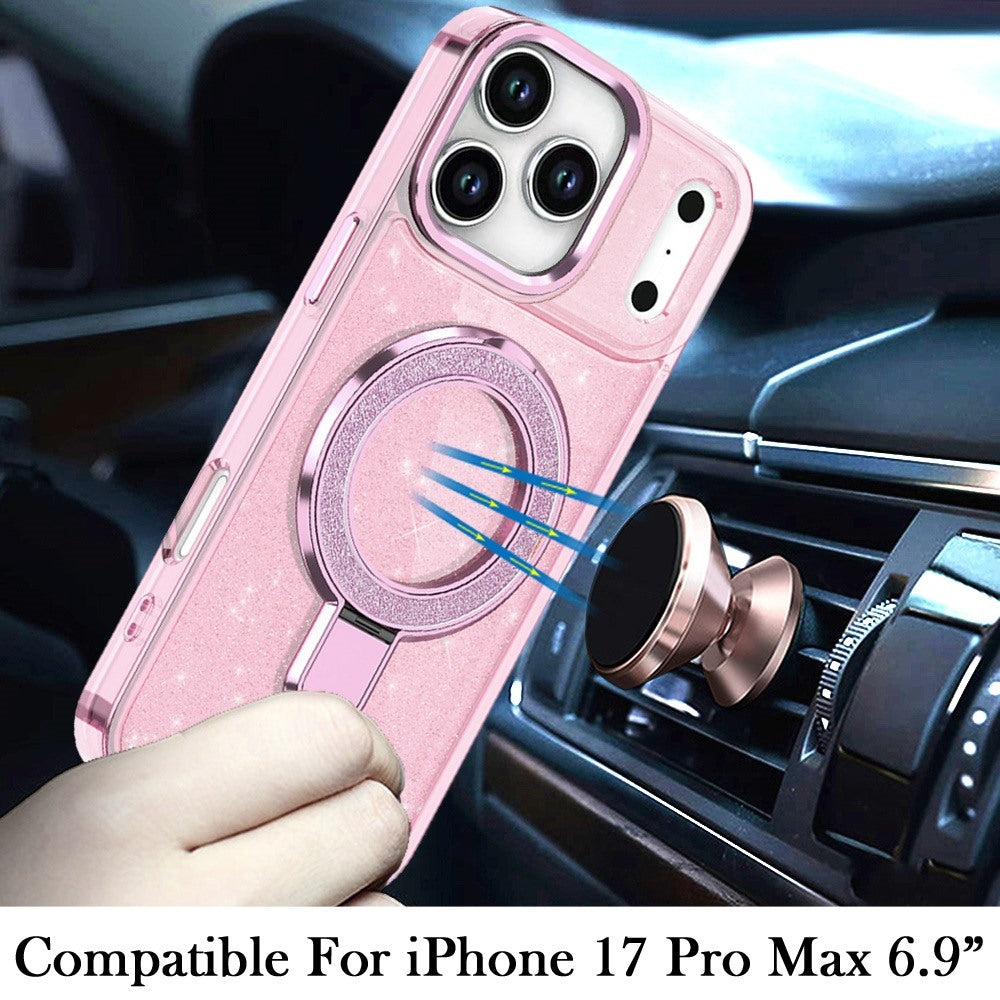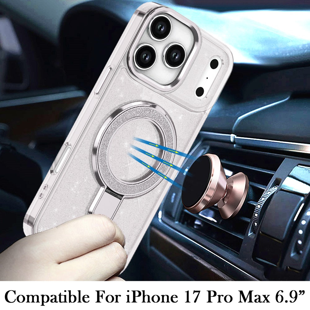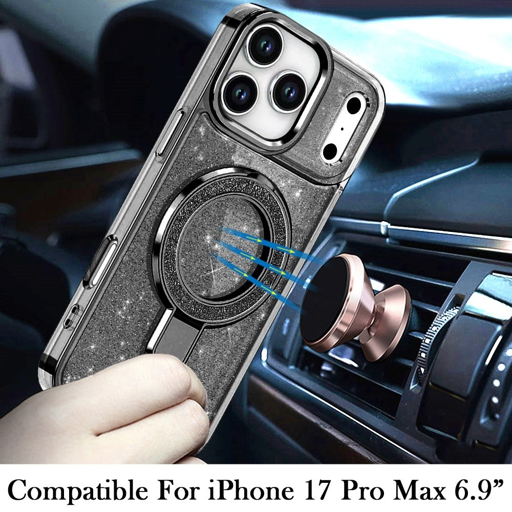 For iPhone 17 Pro Max Case Full Glitter w/ Magnetic Circle Stand +Tempered Glass