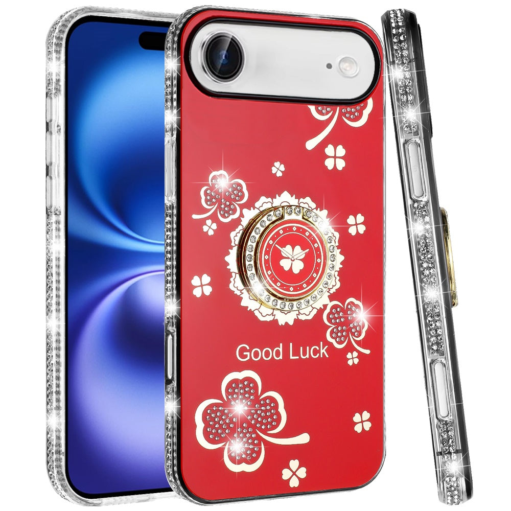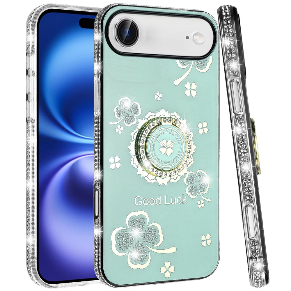 Glitter Four Leaf Clover Design All Around Crystal Studded Ring Stand Cover + Tempered Glass Screen Protector