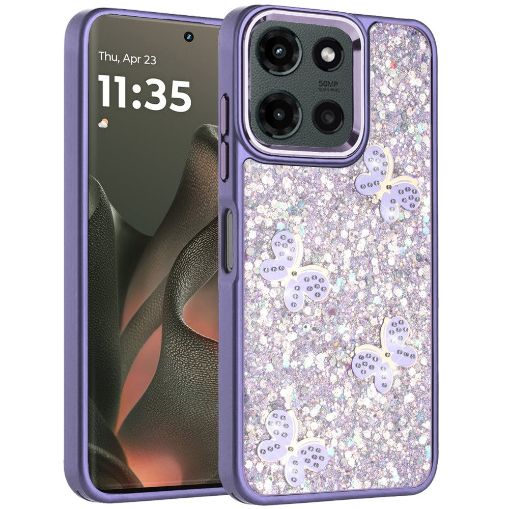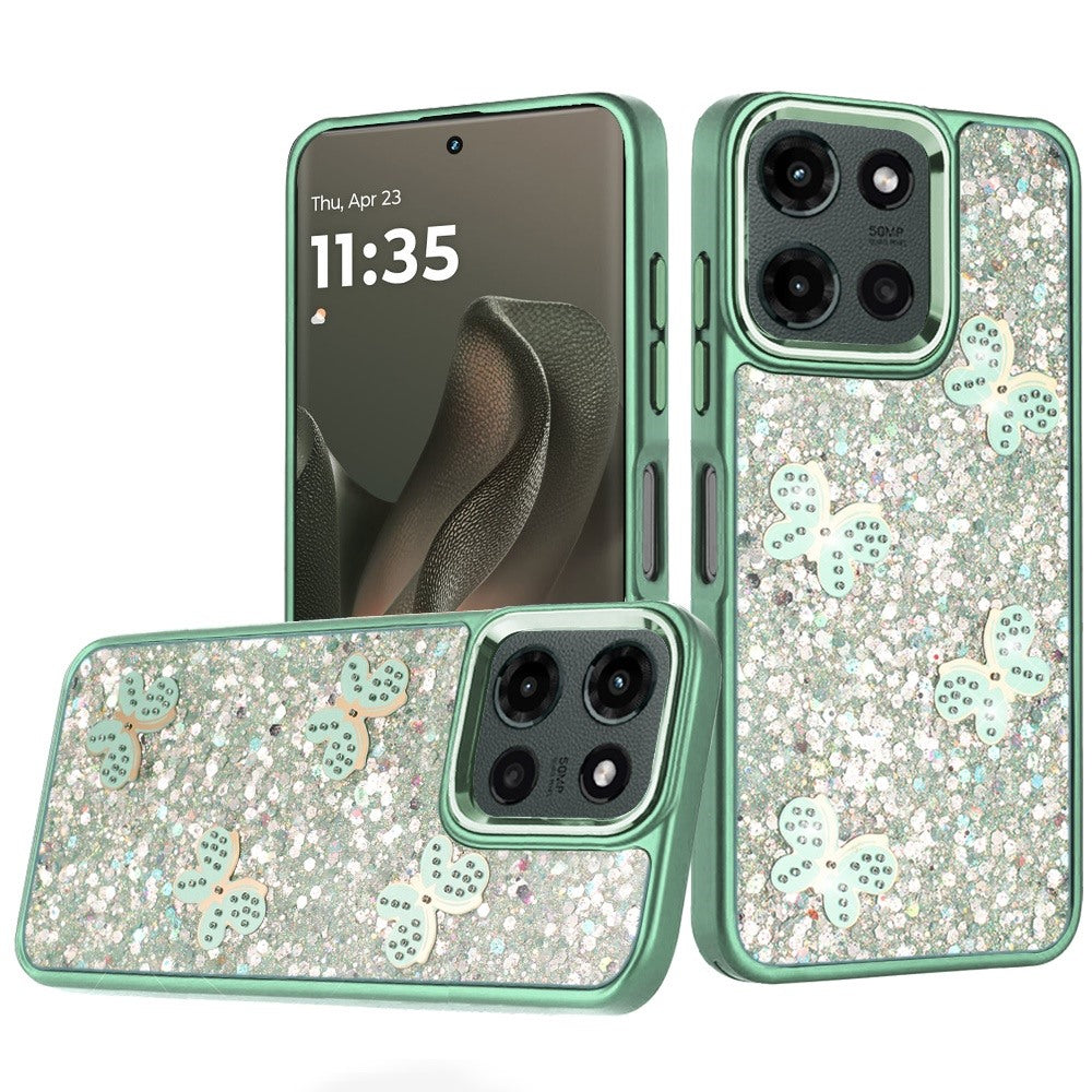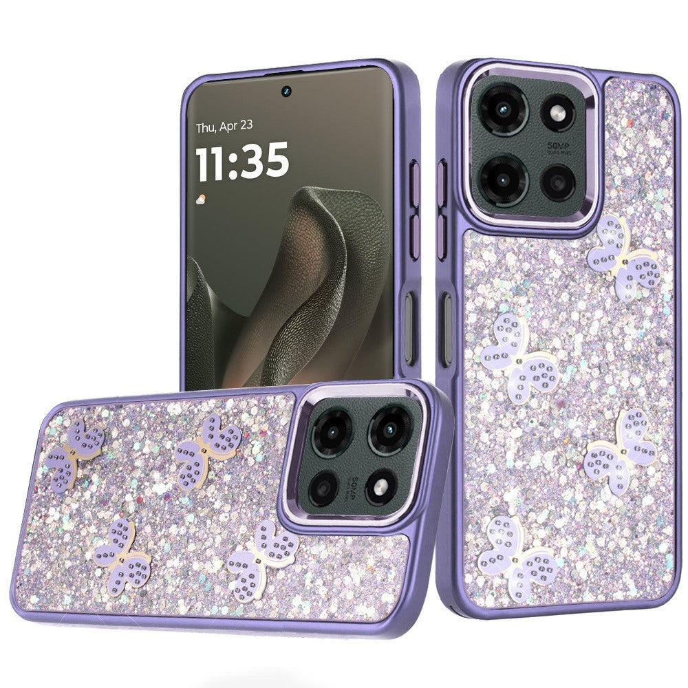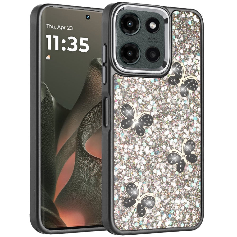 Full Glitter Flakes Phone Case with Cute Butterflies and Metallic Trim Screen Protector