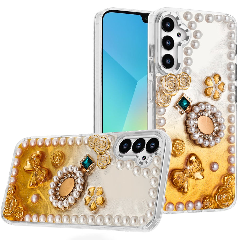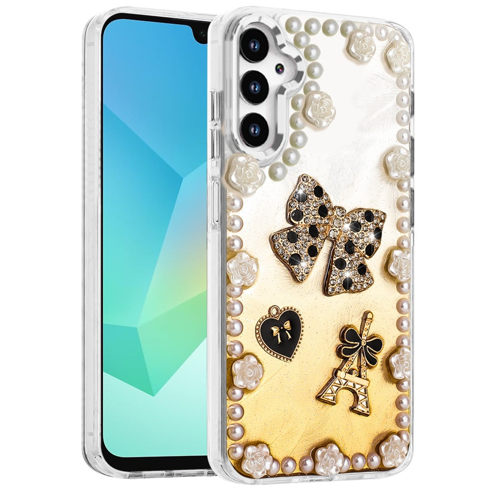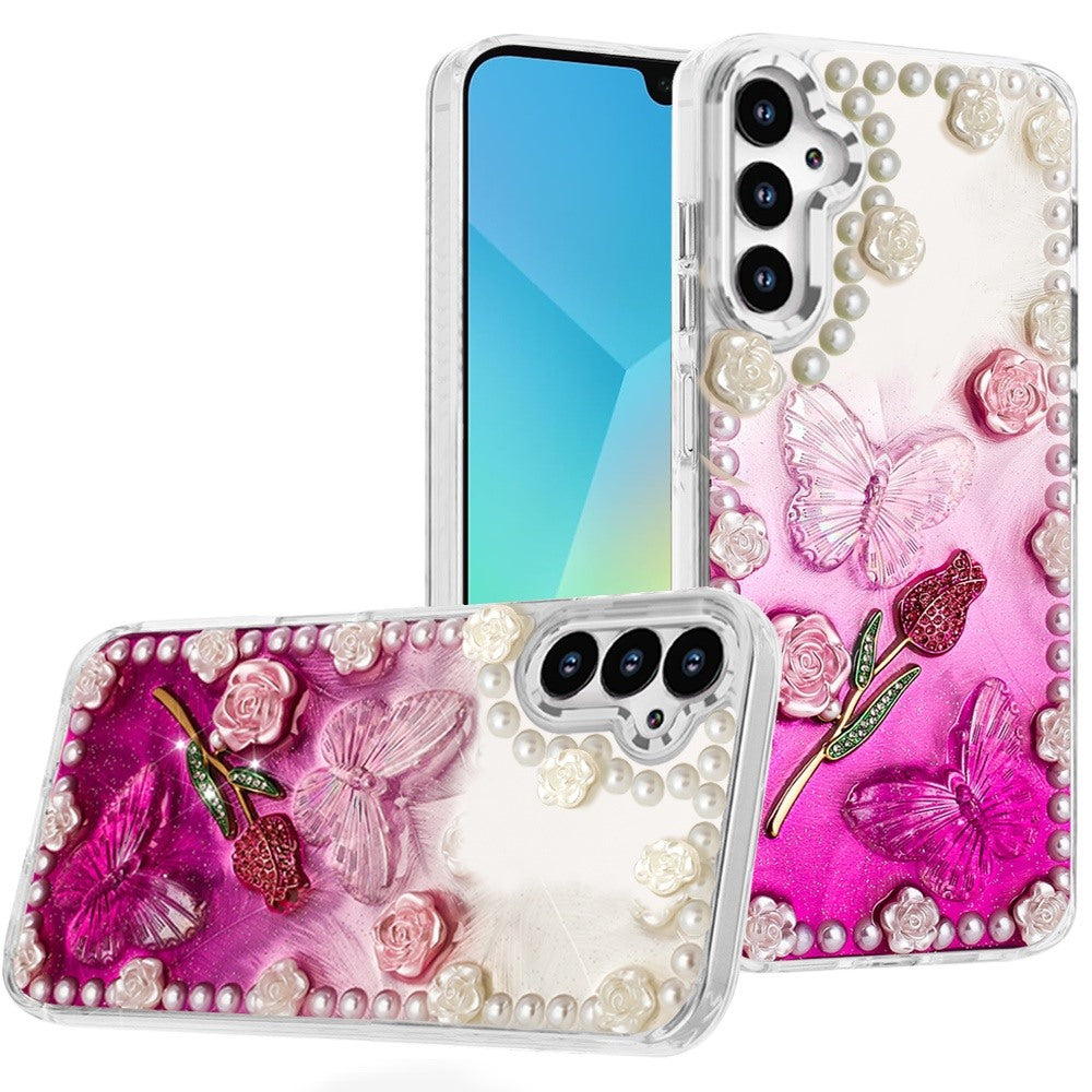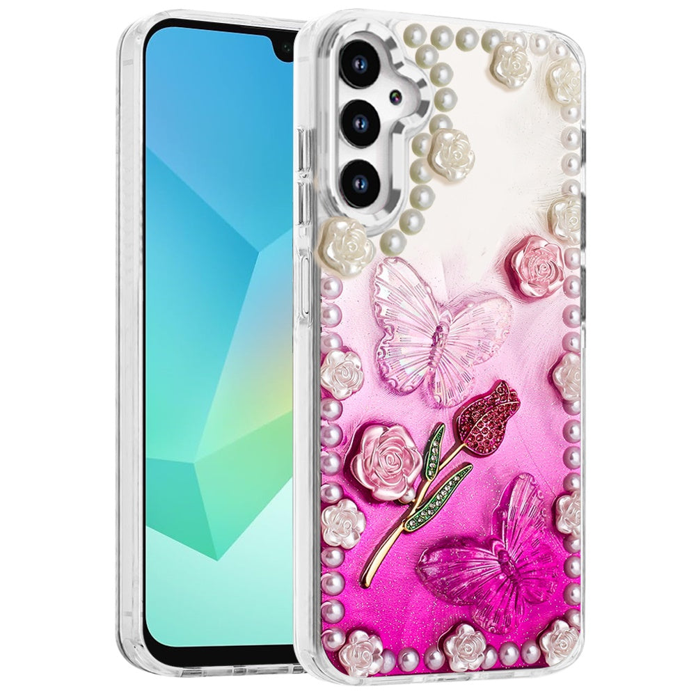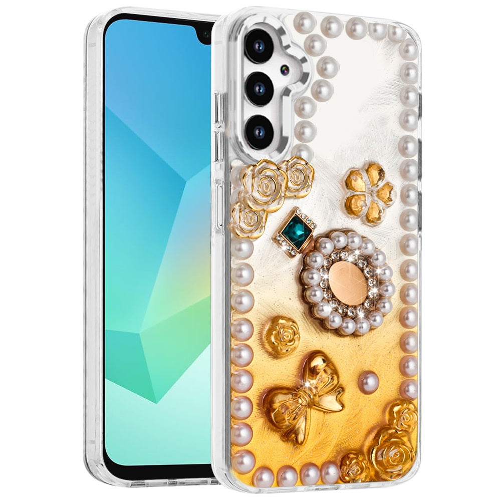 For Samsung A16 5G Case Floral and Faux Pearl Trim w/ 3D Charms + Tempered Glass