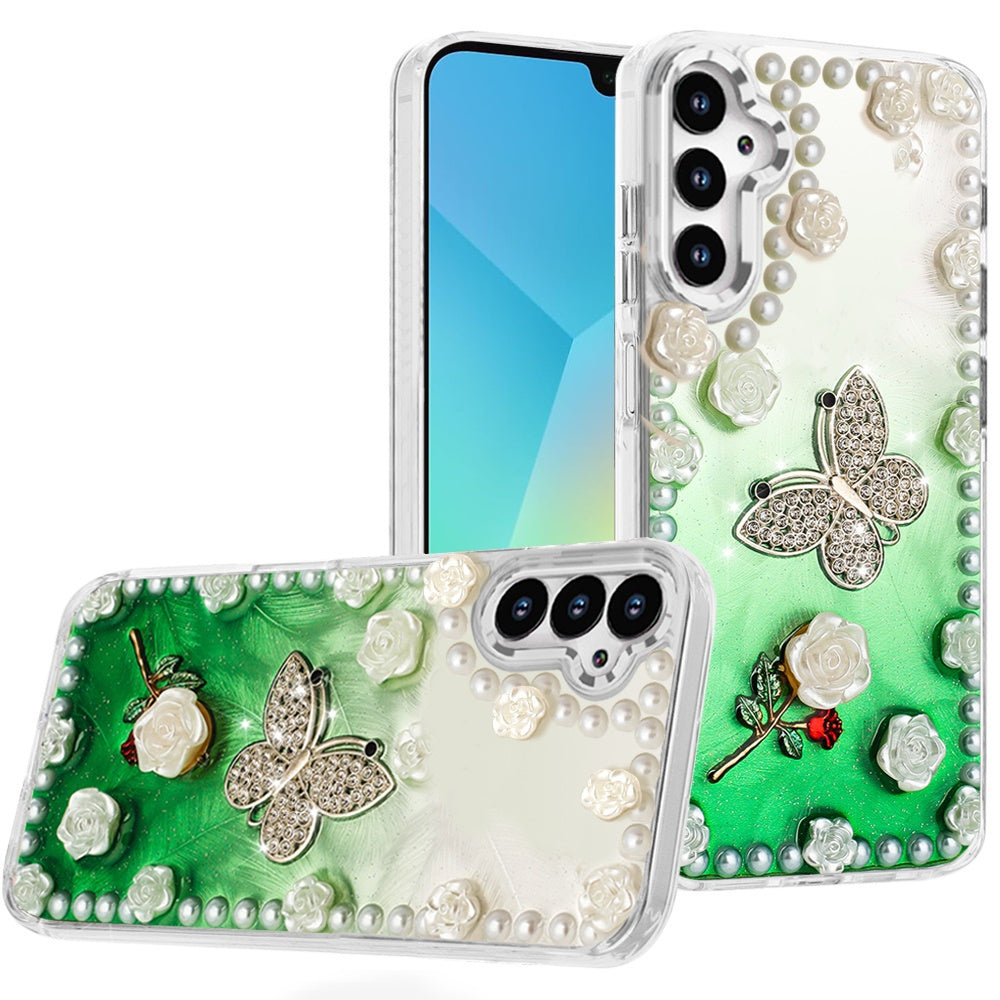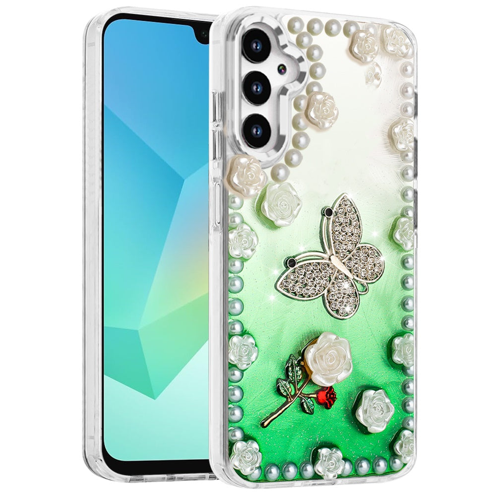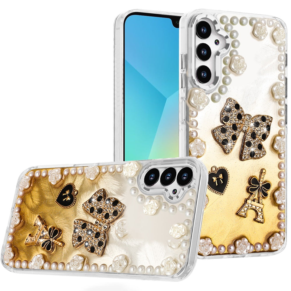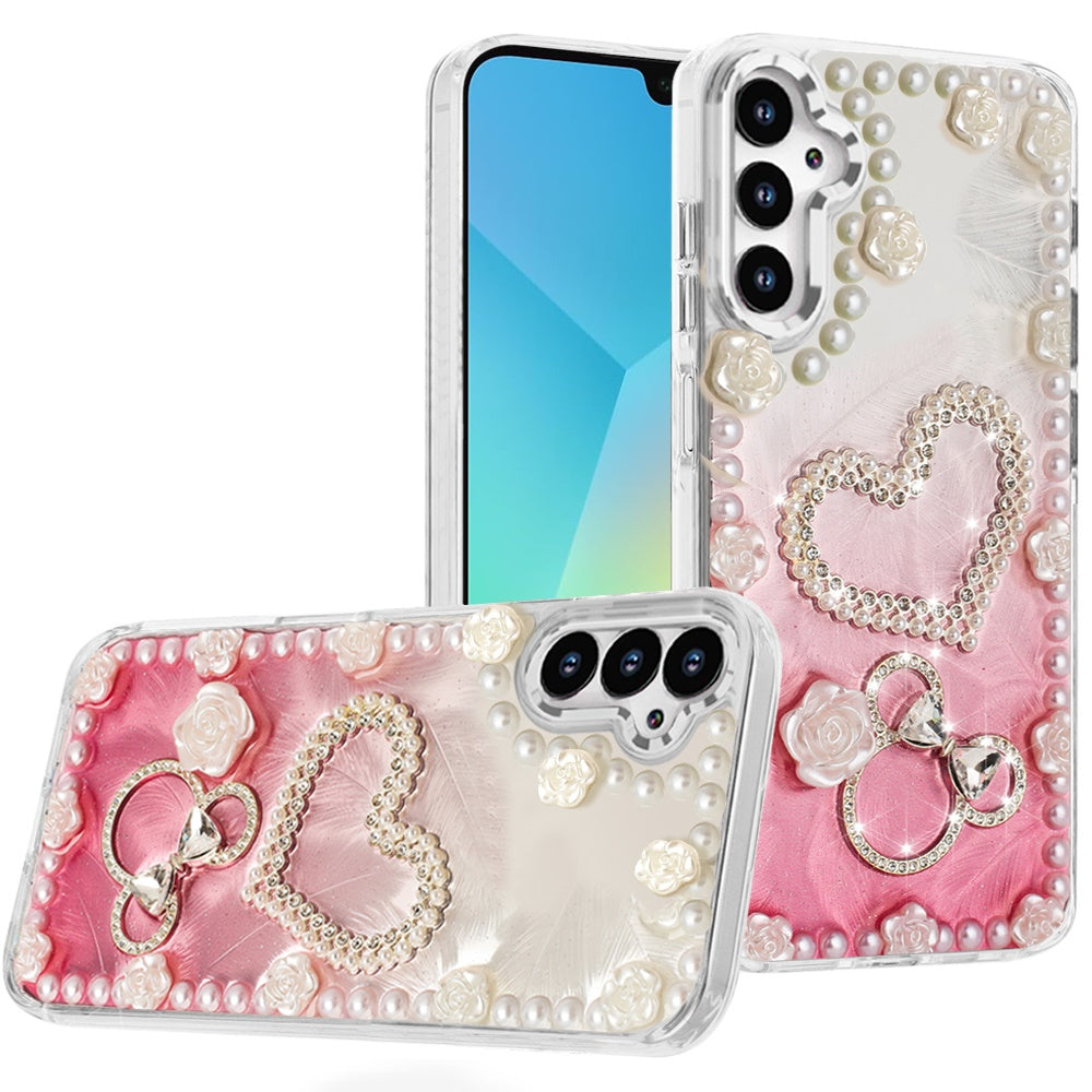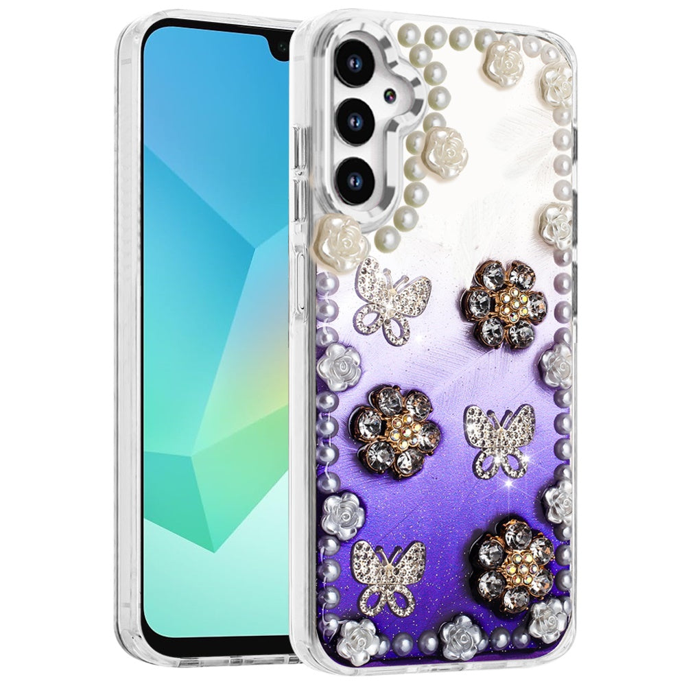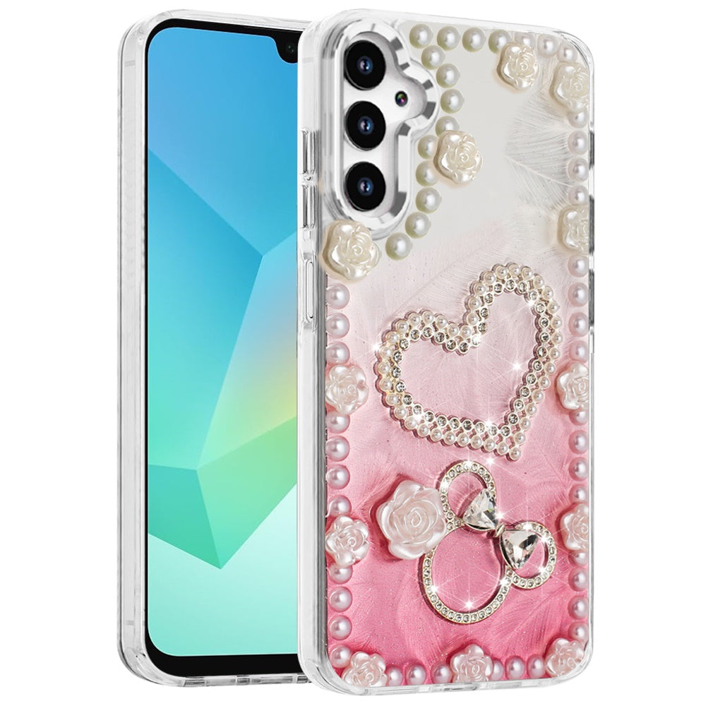 For Samsung A16 5G Case Floral and Faux Pearl Trim w/ 3D Charms + Tempered Glass