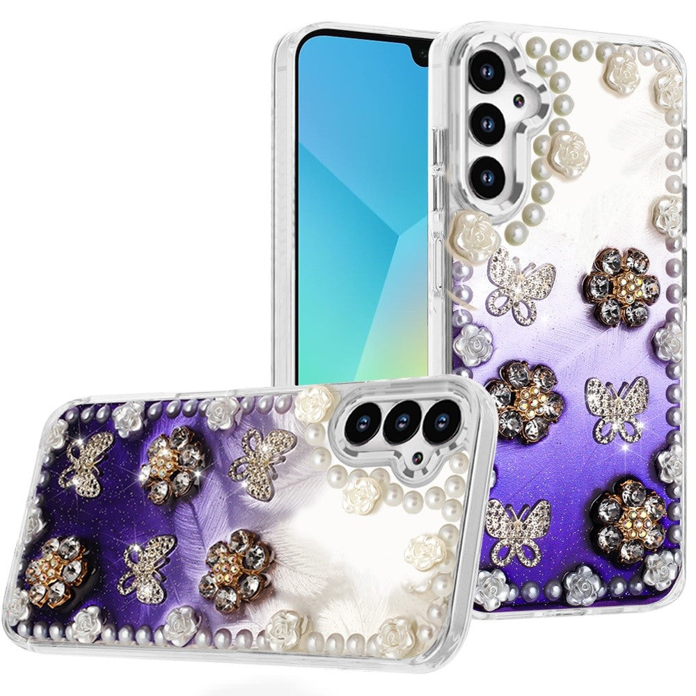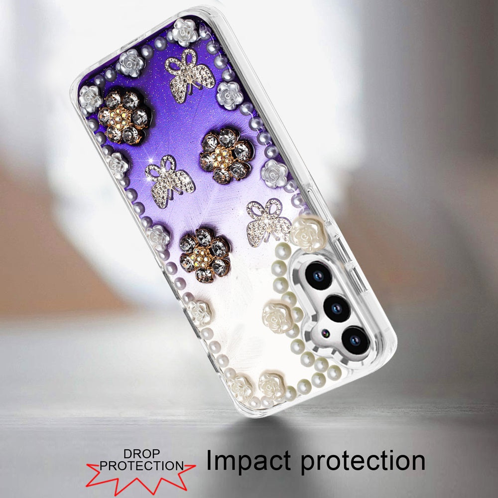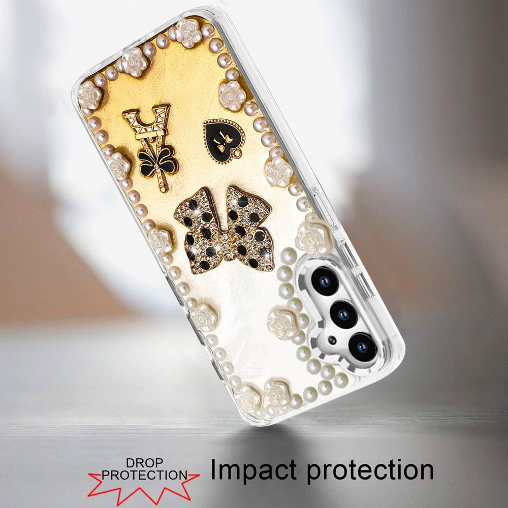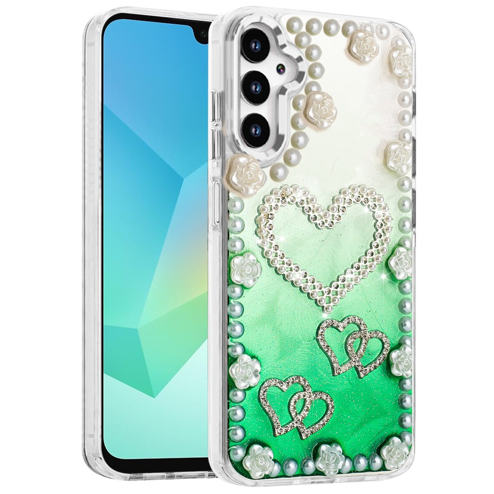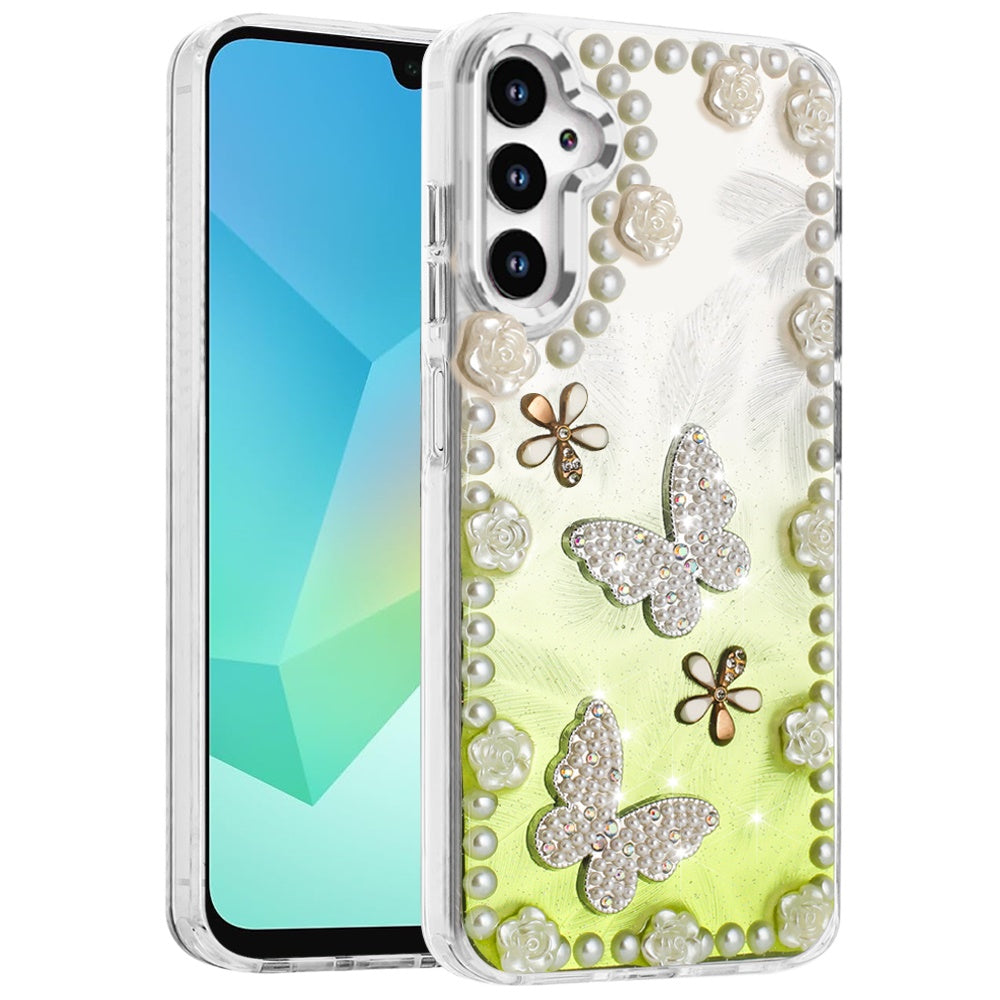 For Samsung A16 5G Case Floral and Faux Pearl Trim w/ 3D Charms + Tempered Glass