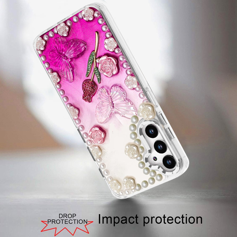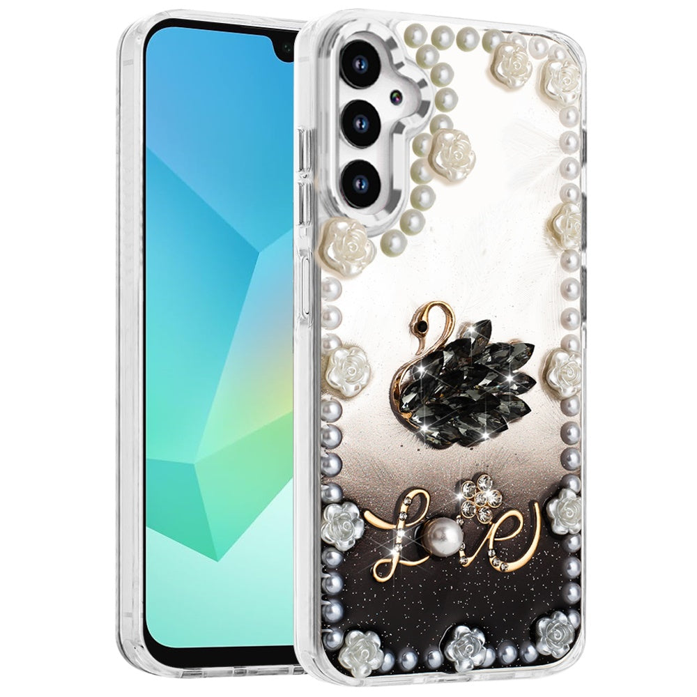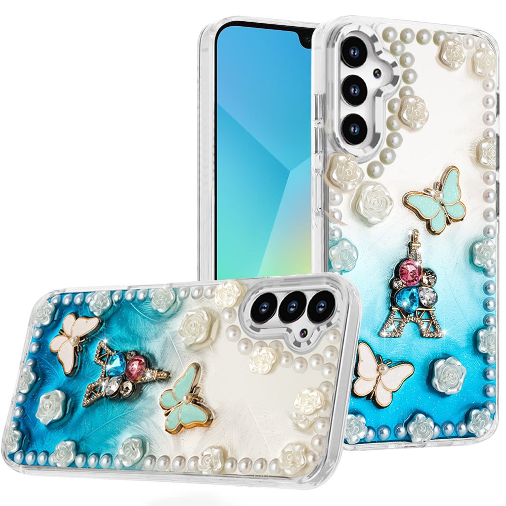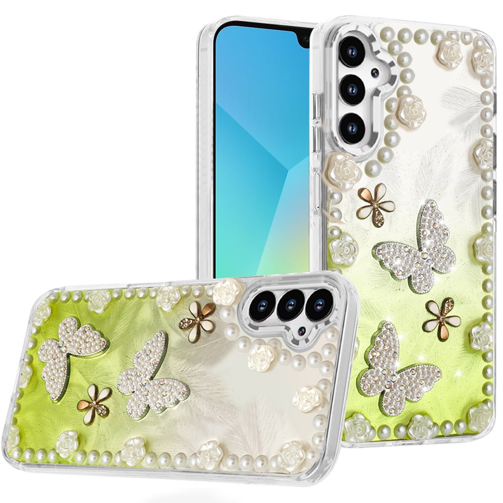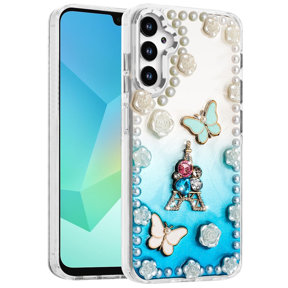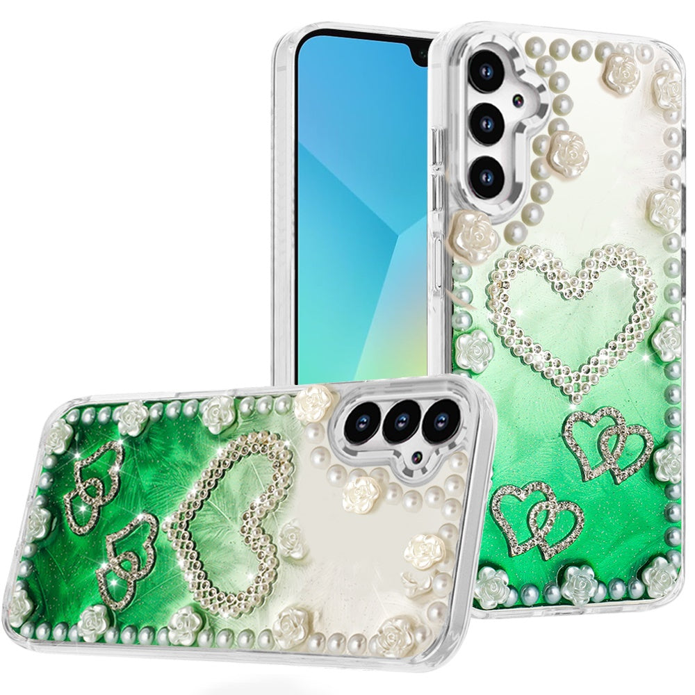 For Samsung A16 5G Case Floral and Faux Pearl Trim w/ 3D Charms + Tempered Glass