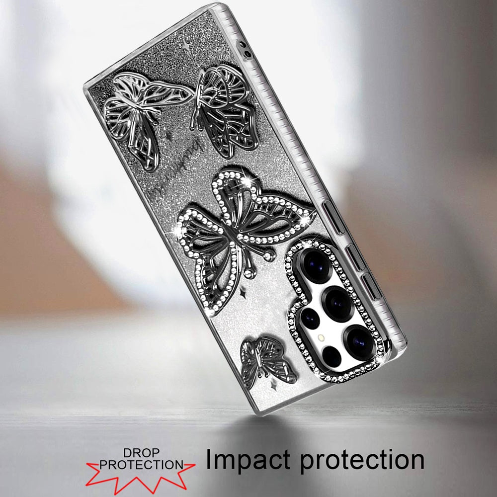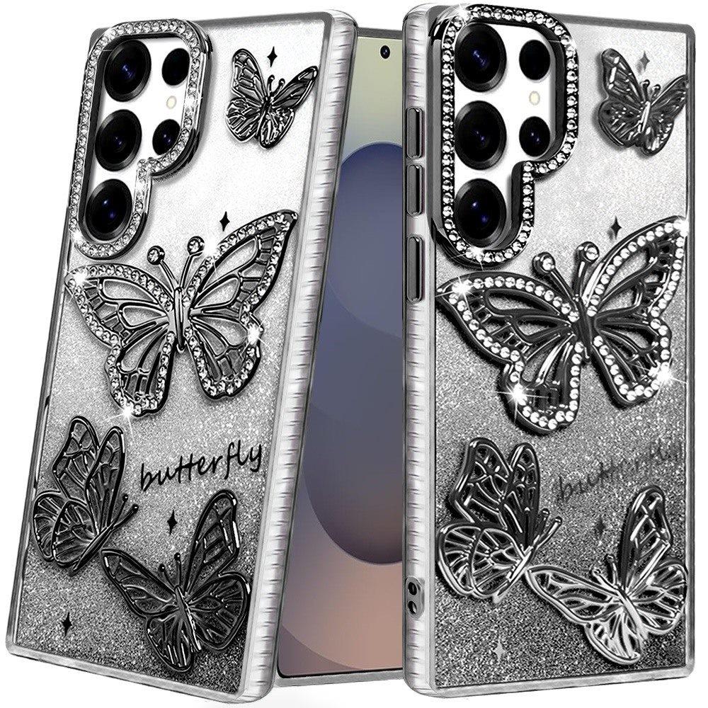 Bling Butterflies 3D Rhinestone Glitter Phone Cover with Tempered Glass Screen Protector