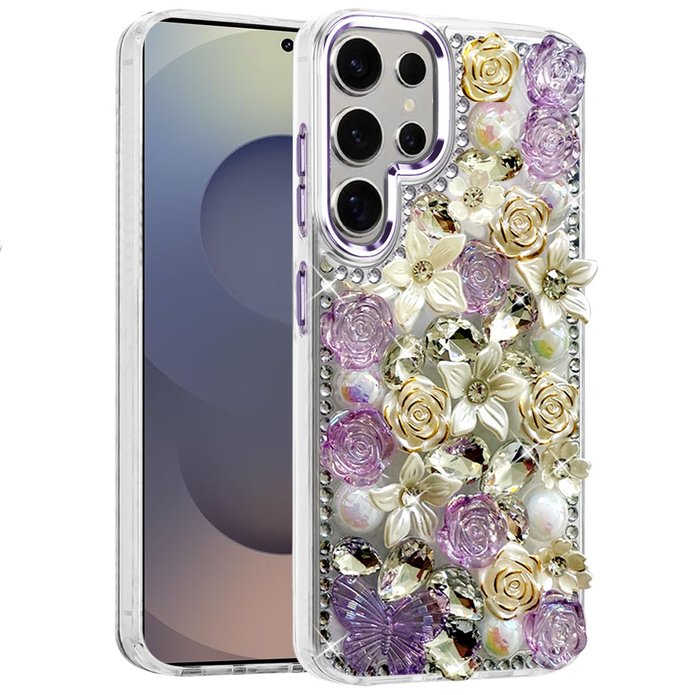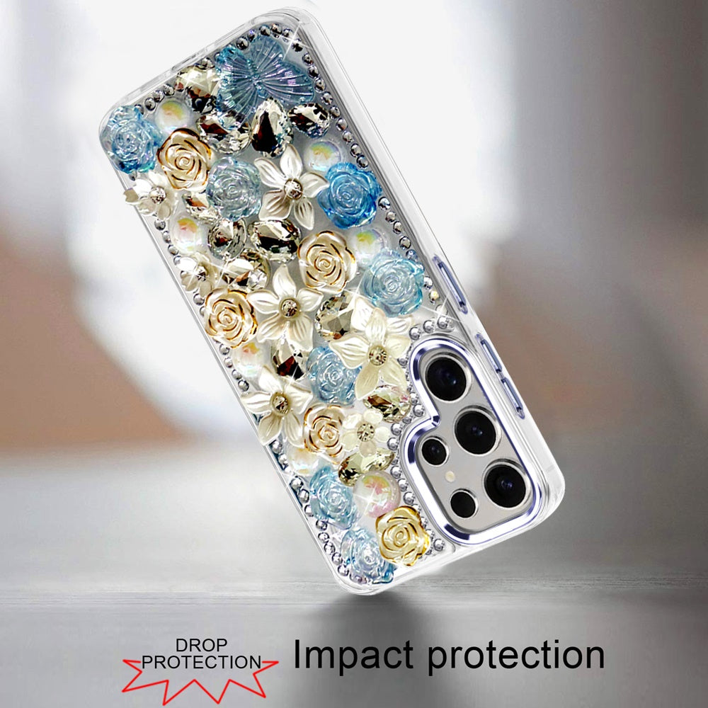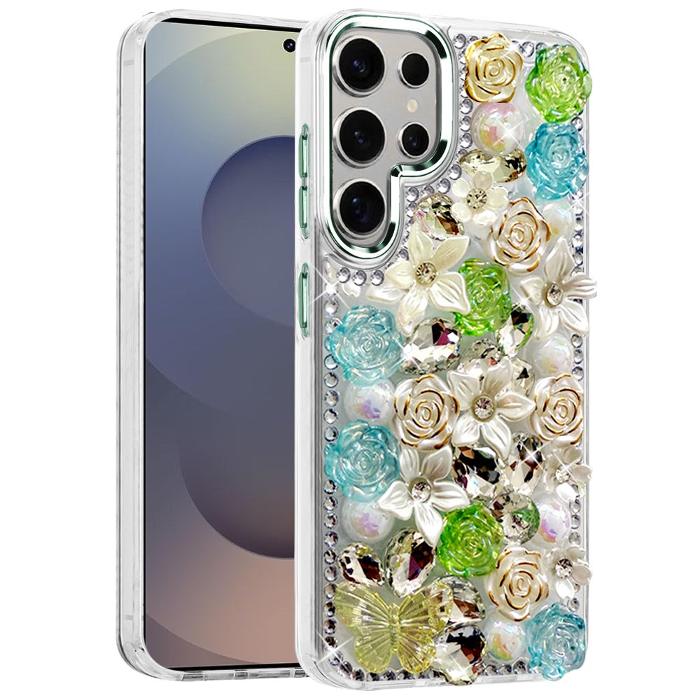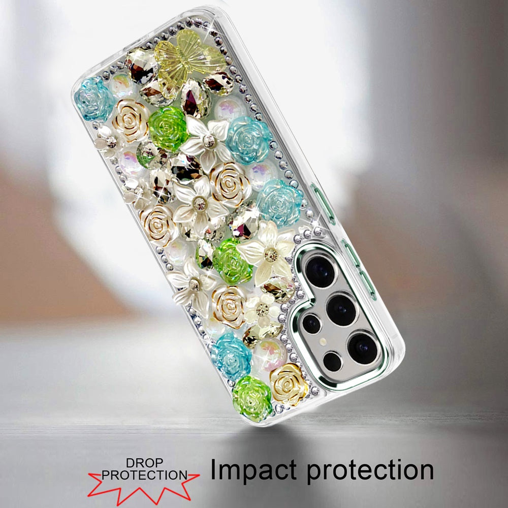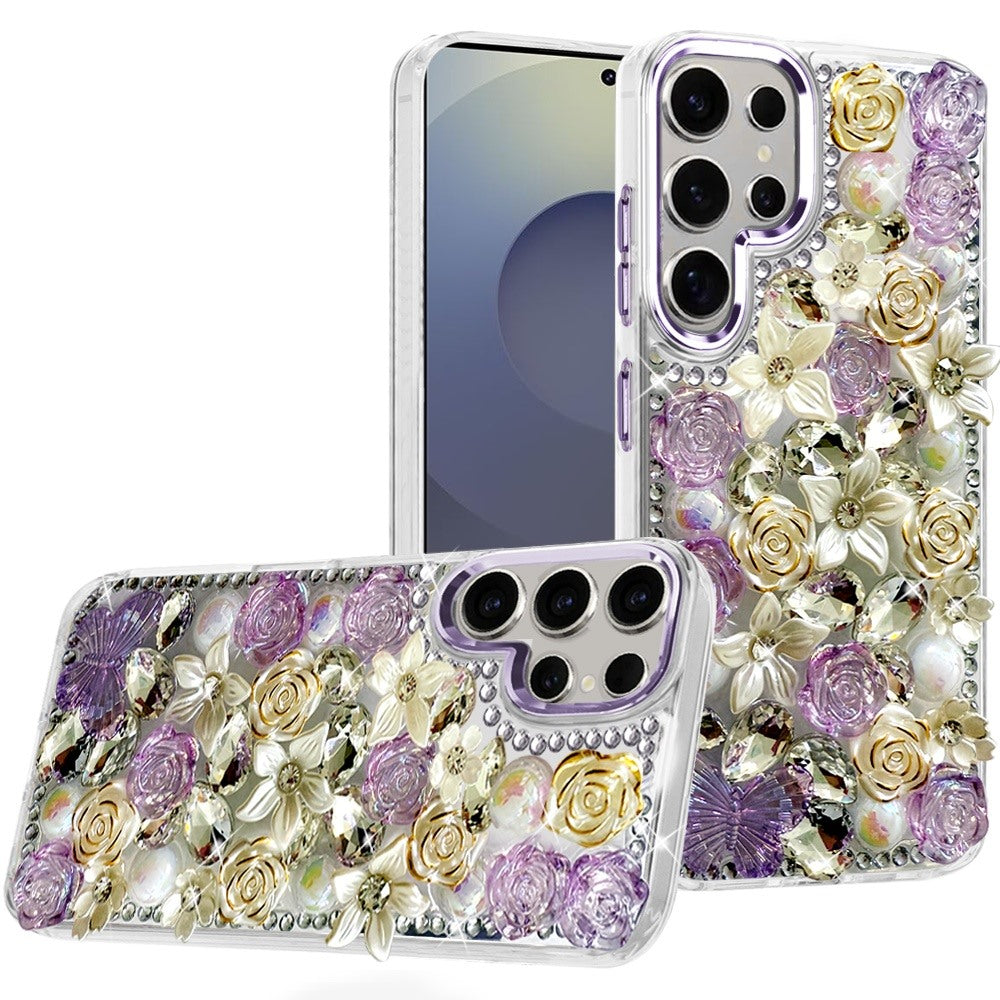3D Full Floral Arrangement Shimmering Bling Phone Cover + Tempered Glass Screen Protector