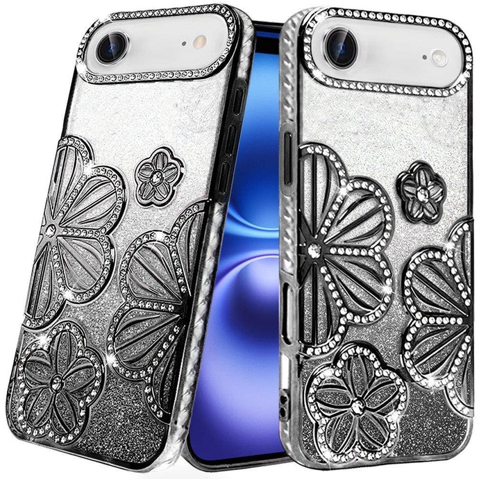 For iPhone Air Case Bling Floral 3D Glitter TPU Phone Cover + Tempered Glass