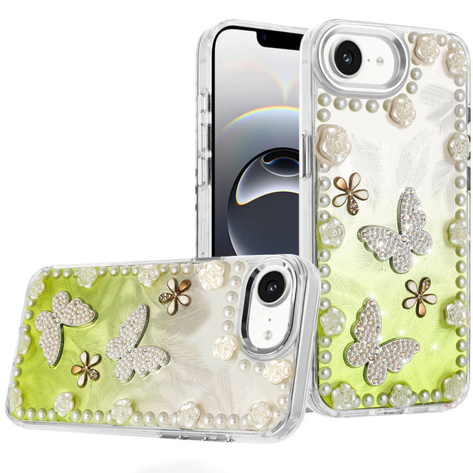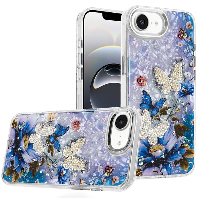 For iPhone 16e Case Epoxy Glitter with 3D Beaded Butterflies + Tempered Glass