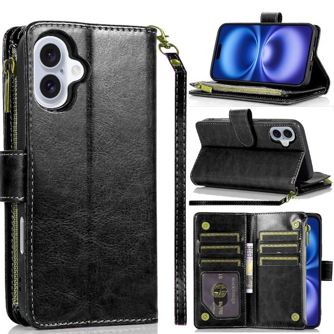 For iPhone 17 Case Luxury PU Leather Phone Wallet with Zipper + Tempered Glass