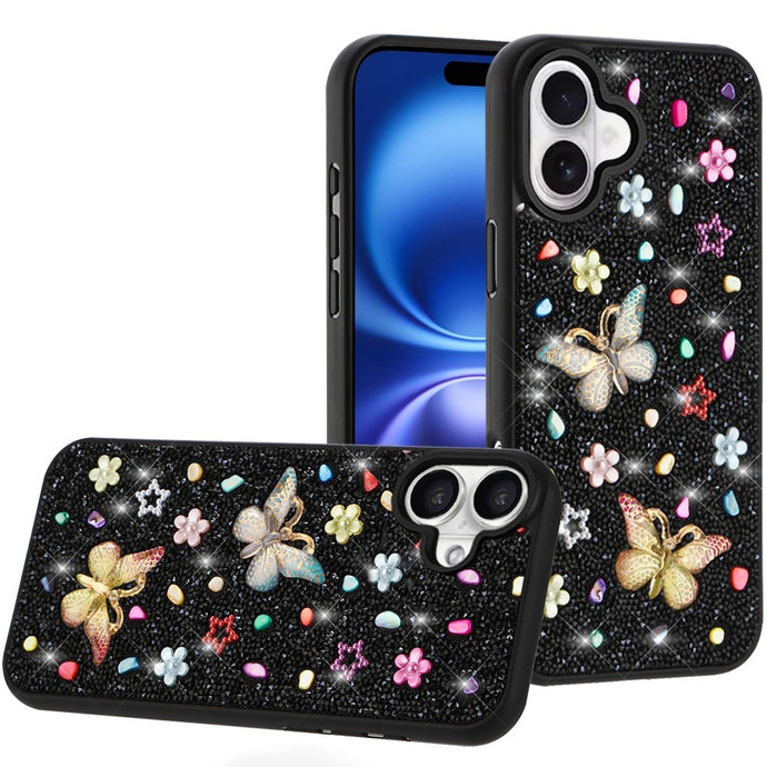 For iPhone 17 Case Butterfly 3D Jewel Glitter Bling Phone Cover + Tempered Glass