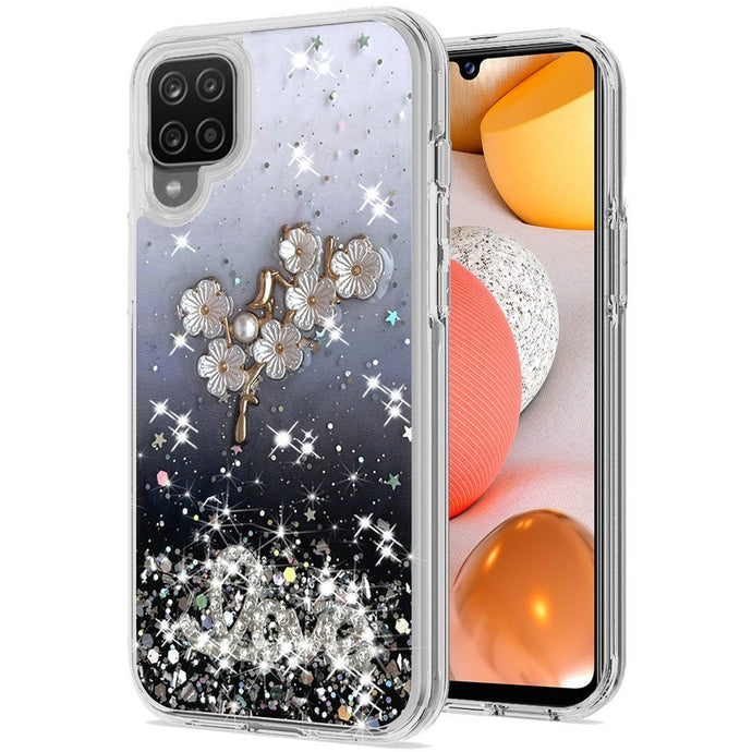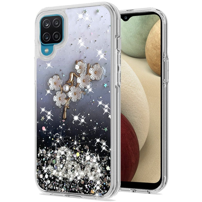For Samsung Galaxy A12 5G Love Floral Ornament Epoxy Shimmer Glitter Case Cover